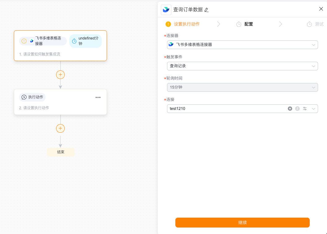 按需添加节点并配置节点动作/组件,直至集成流配置完成。
