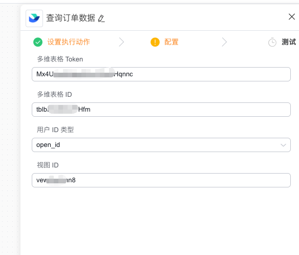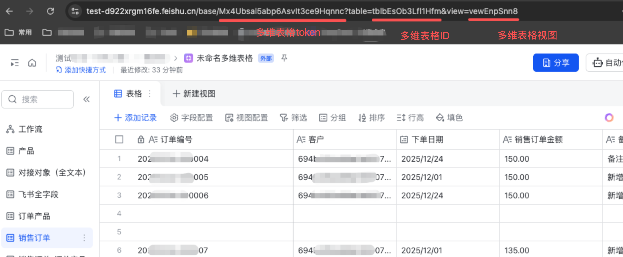 根据飞书多维表格URL链接,依次找到 多维表格token、多维表格ID、视图ID 信息填写到 配置 信息