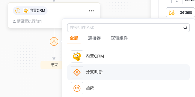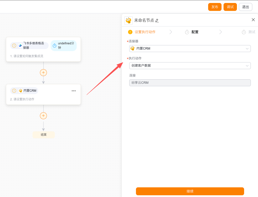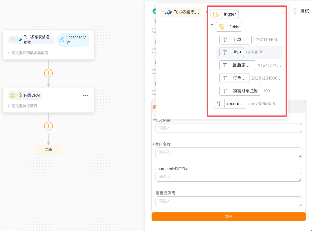 进入下一步配置字段映射,在浮窗选择所选节点的字段与CRM节点字段映射:(可以切换固定值方式配置固定值)