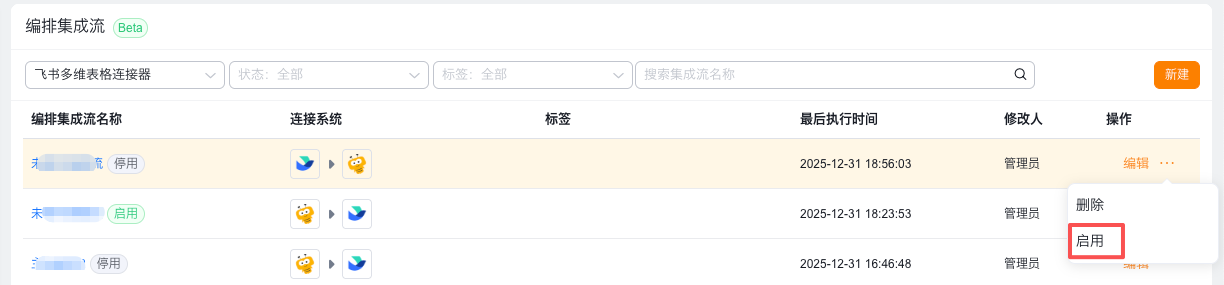 返回集成流列表,启用该集成流,即可开始按集成流配置同步数据: