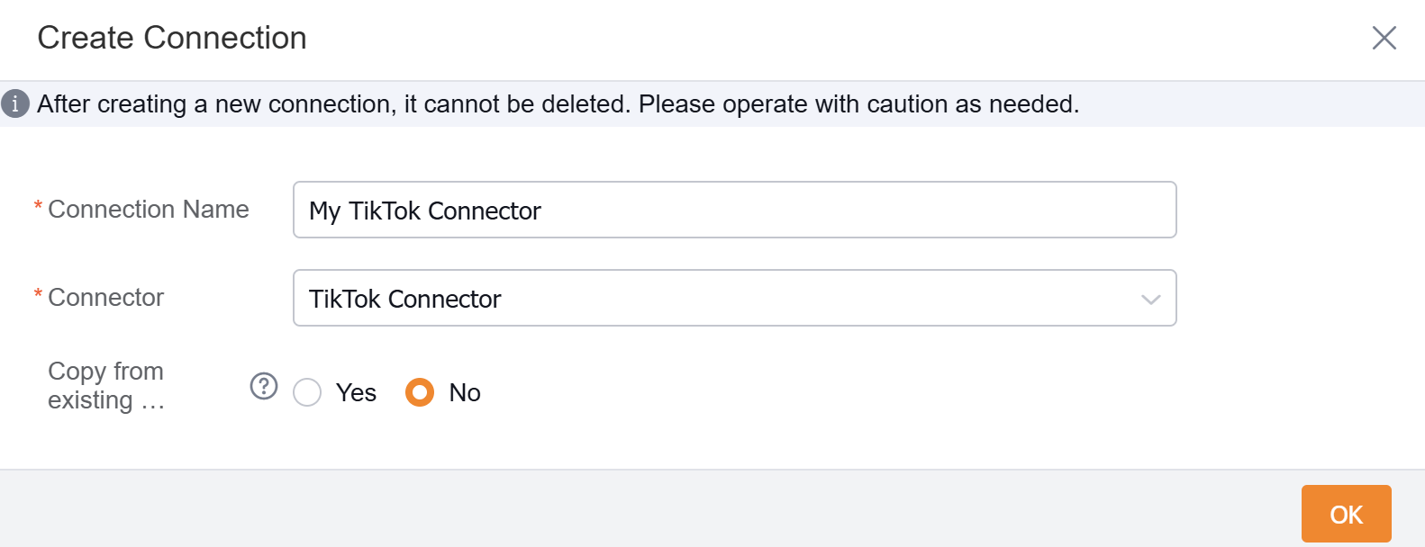进入Connector>Connector Management 页面,点击新建连接器,按提示填写连接器名称Connector下拉选择 TikTok连接器,点击 OK 确定新建: