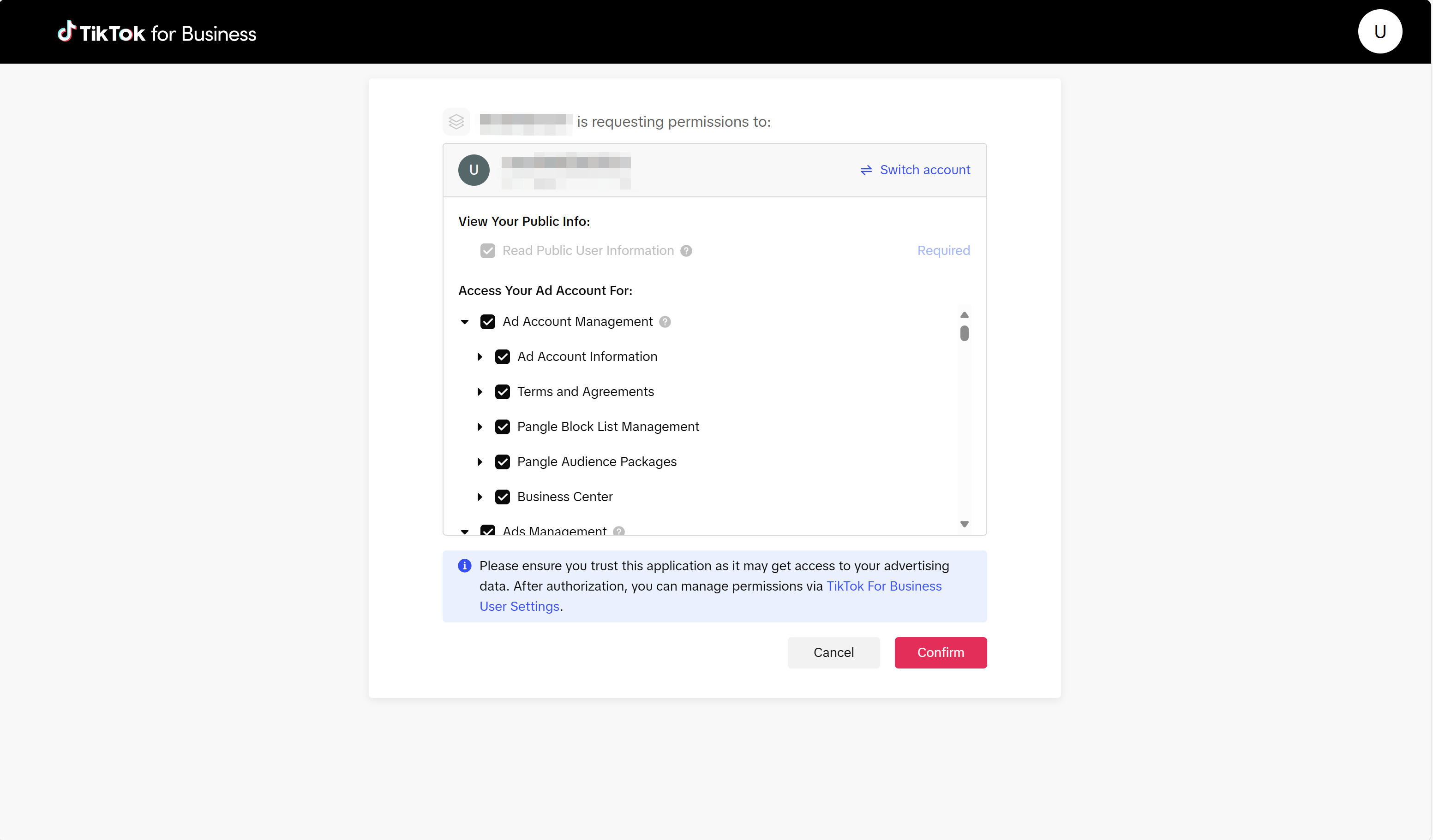 在 Authorization Configuration 授权配置部分的 Authorization status 授权状态栏点击 Deauthorization 去授权(浏览器登录过Tiktok账户,会弹出下图界面)
