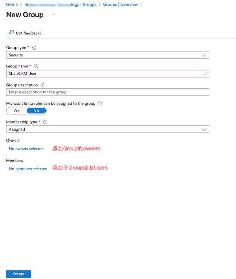 进入Manage Microsoft Entra ID,选择Groups菜单,添加新的ShareCRM 组,按提示填写Group name等配置并添加子Group或人员,配置如下图:
