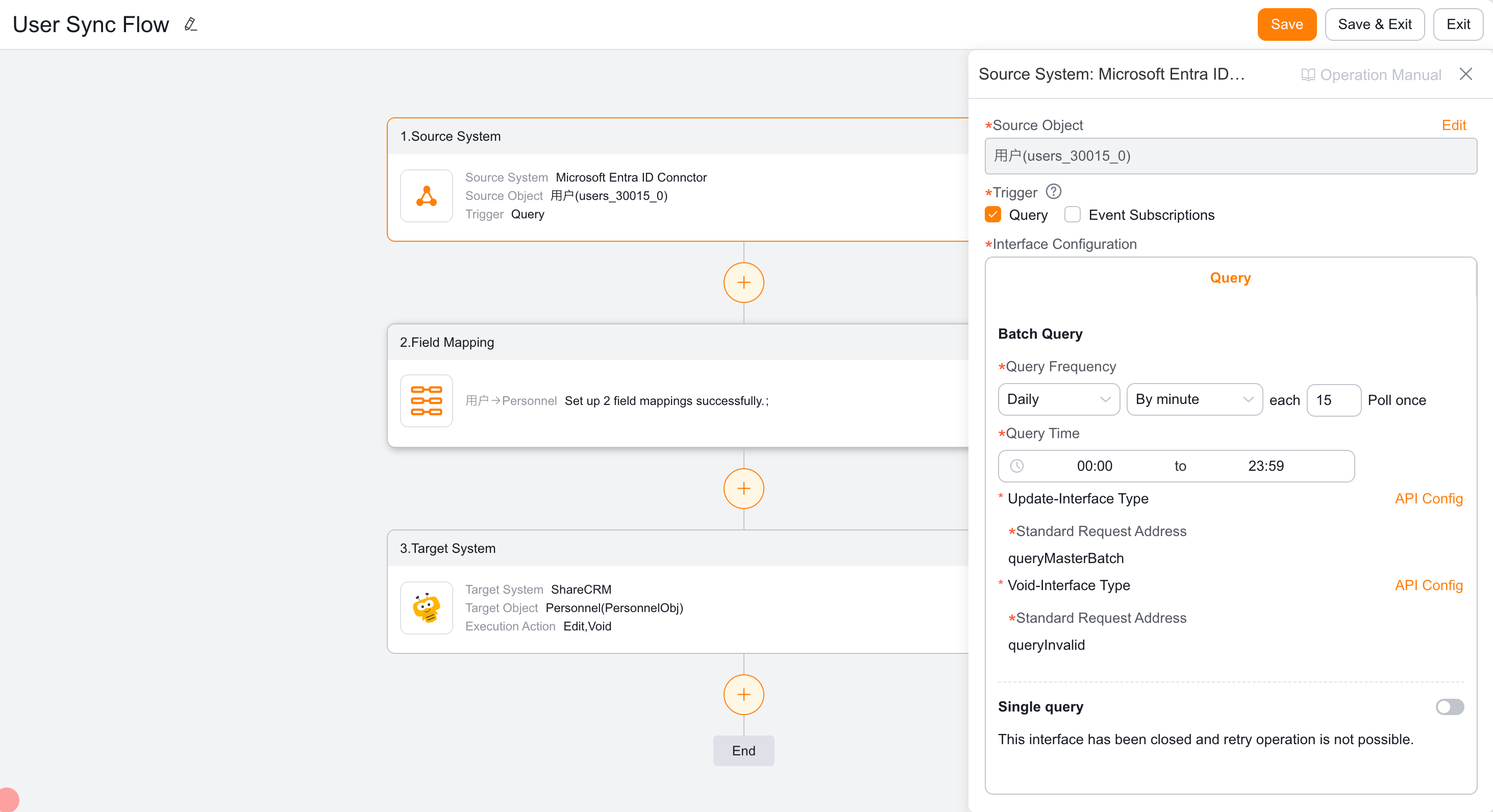 检查集成流配置并启用,创建历史数据同步任务,拉取历史人员数据,增量数据则按配置的轮询评率同步。