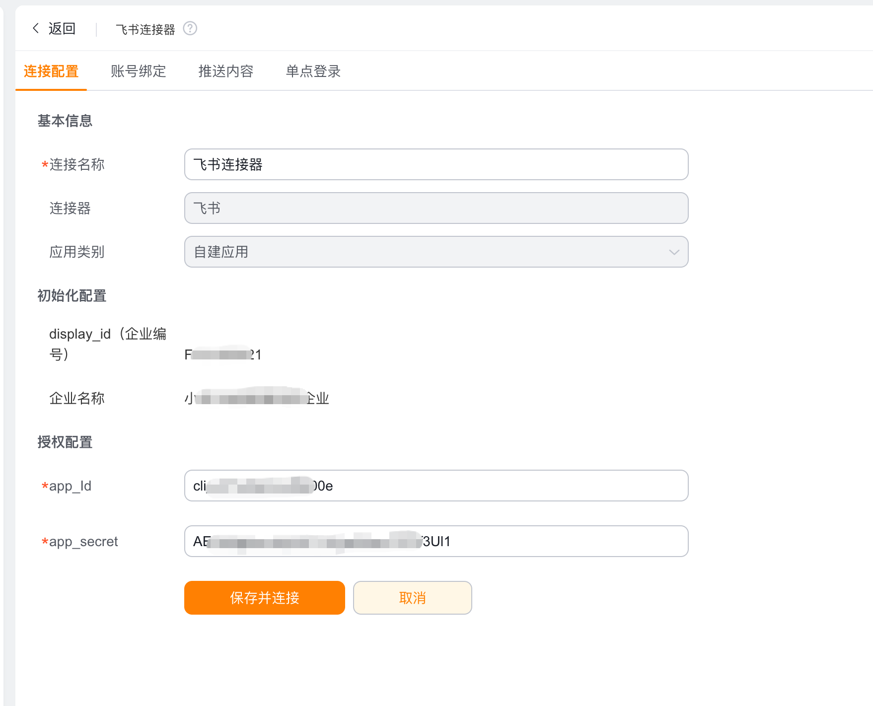 飞书连接器配置项可分为两部分,3.2.1为必配部分,3.2.2~3.2.4为选配部分。选配部分是指可根据客户具体场景来按需配置。