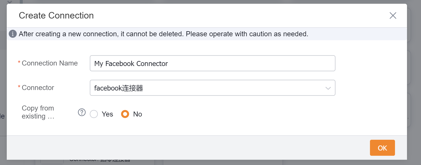 进入Connector>Connector Management 页面,点击新建连接器,按提示填写连接器名称Connector下拉选择 Facebook连接器,点击 OK 确定新建: