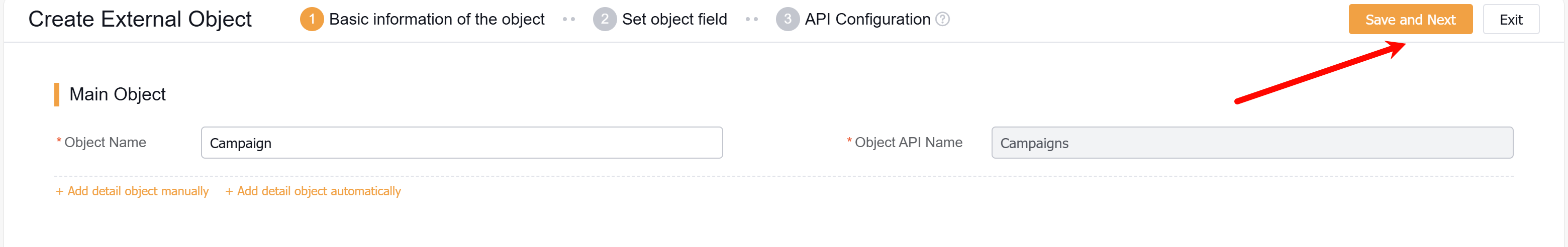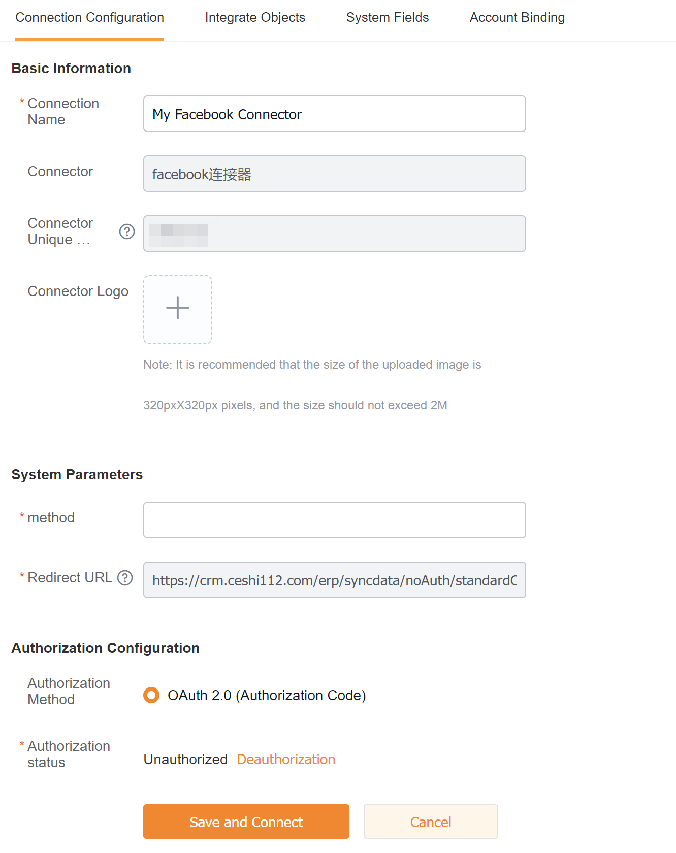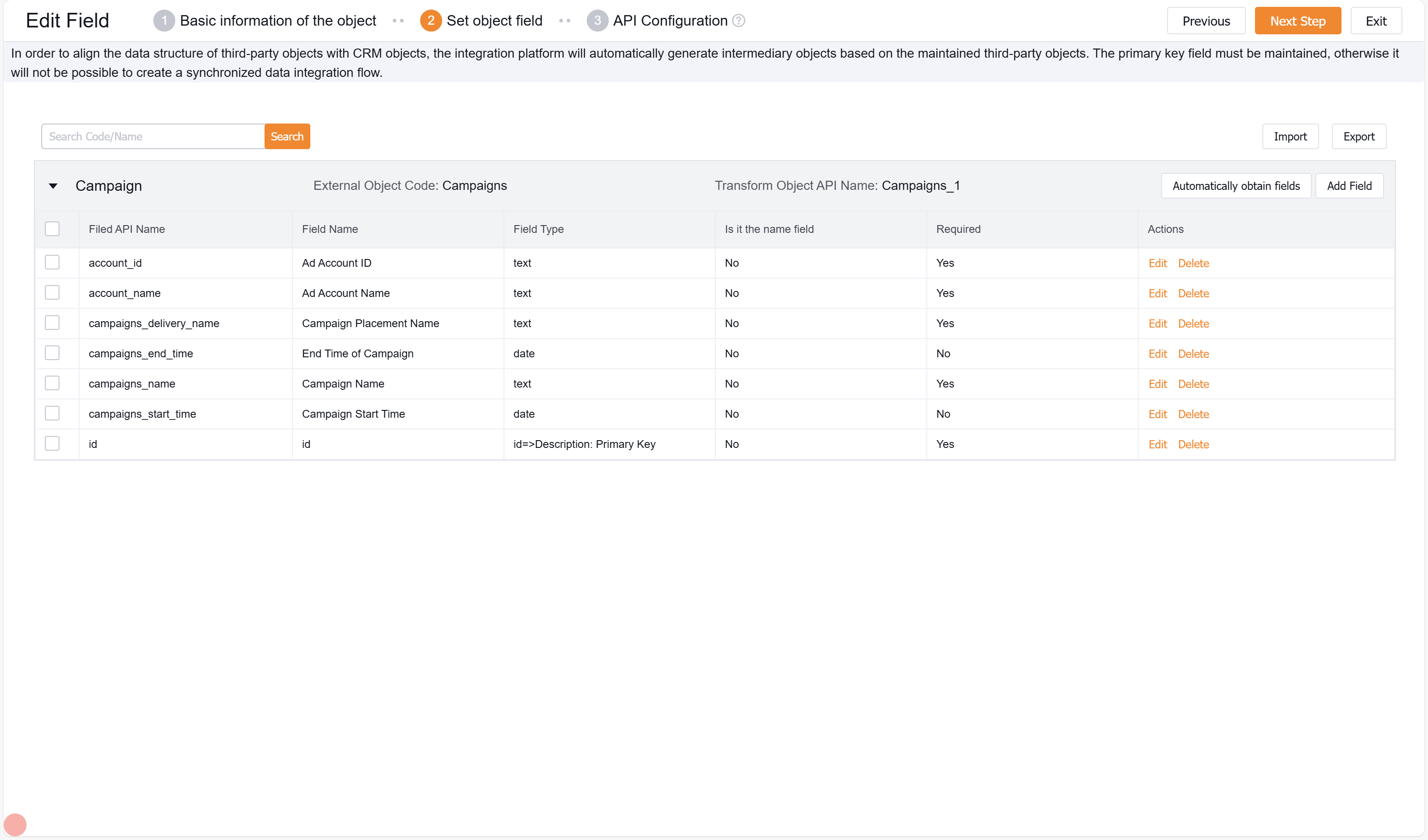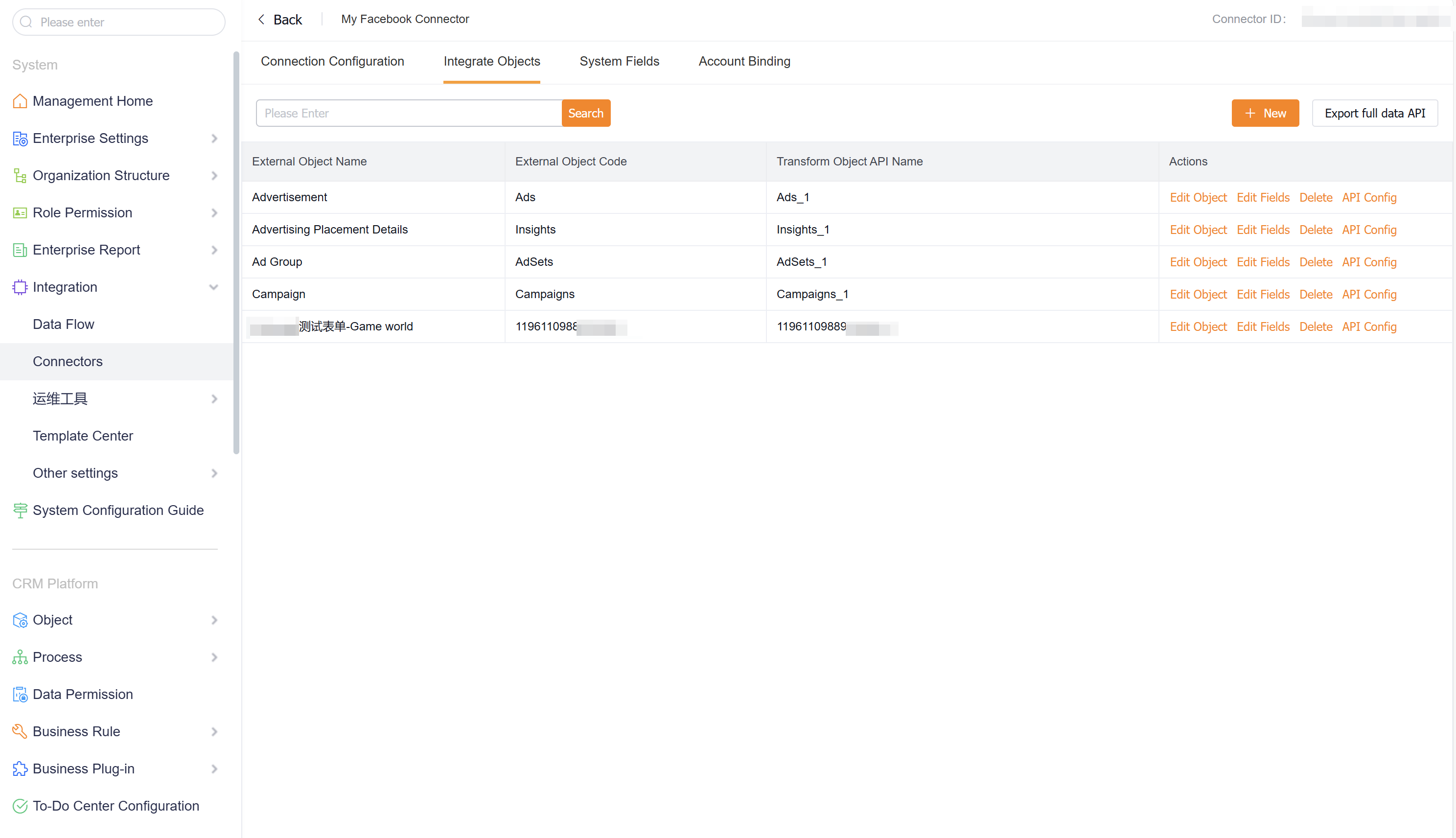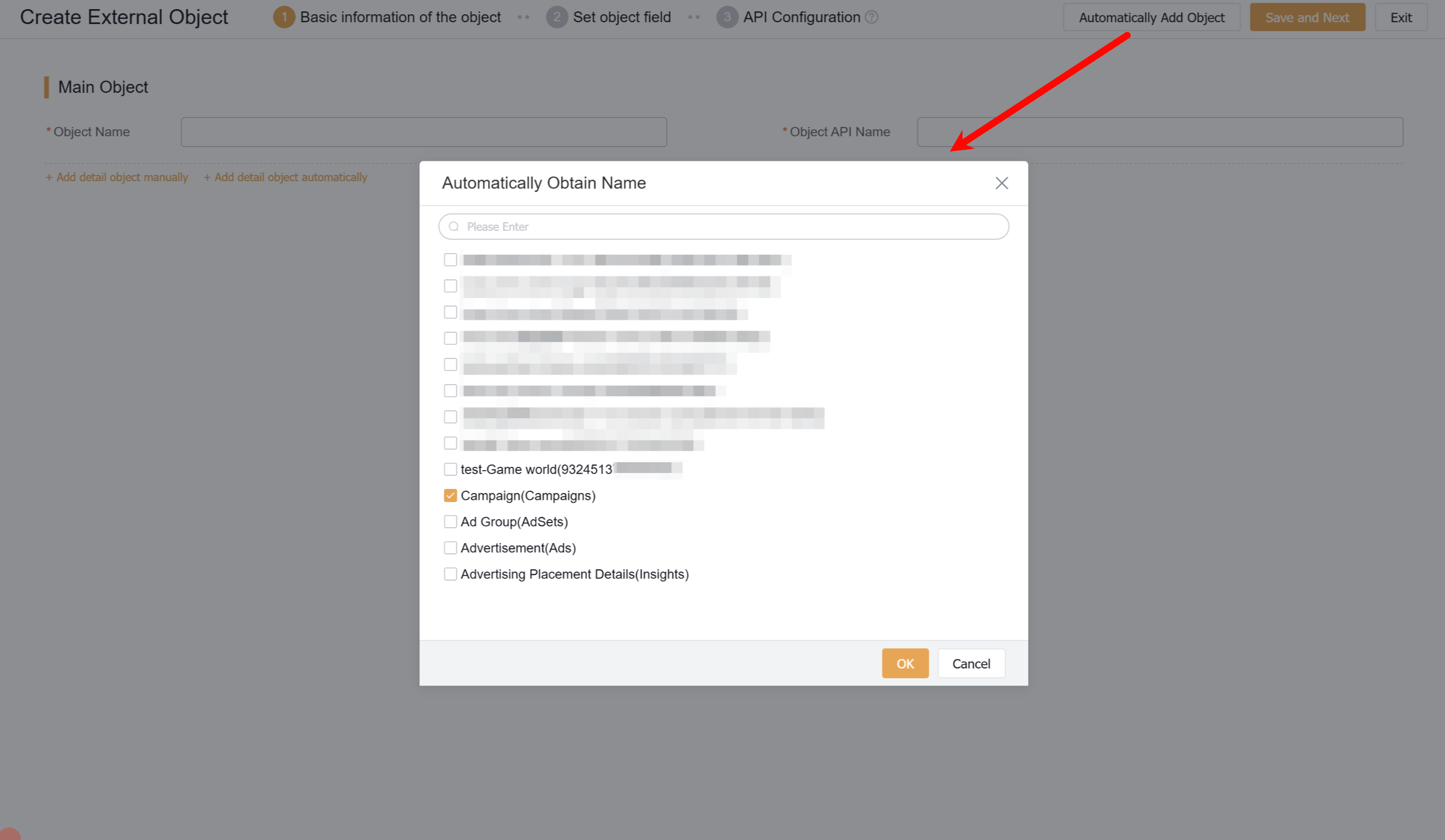 切换到 Integrate Objects 页签,点击 New 新建对象,在新的页面上,点击 Automatically Add Object 按钮,自动获取Facebook对象列表,勾选需要对接的对象,点击 OK 即回填该对象的 Object Name和 Object API Name,点击上方的的 Save and Next 即可自动获取该对象的字段描述: