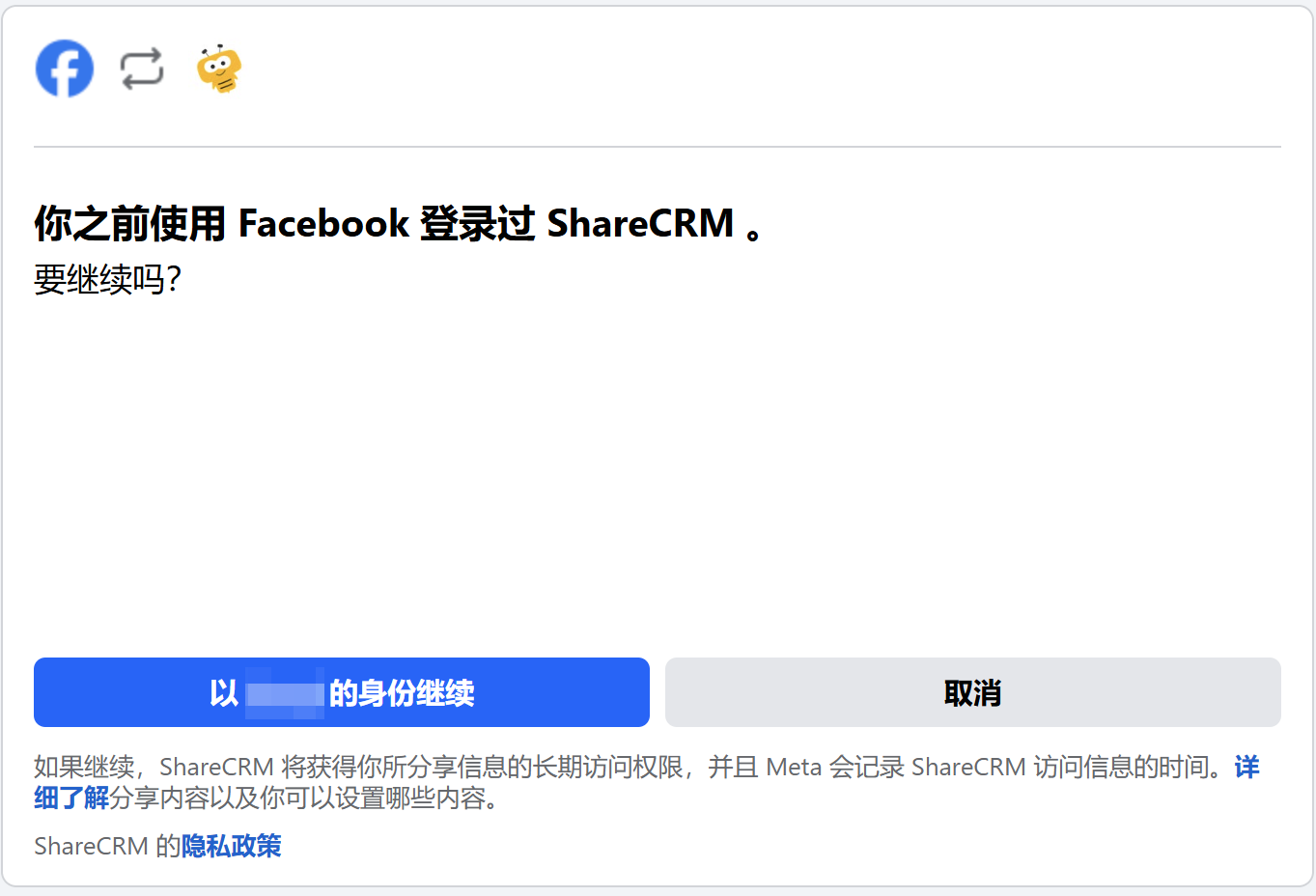 step4:登录Facebook成功后,需要在连接器配置页面再次点(去授权),然后弹出该授权页面,点击继续。跳转回ShareCRM,显示已授权。