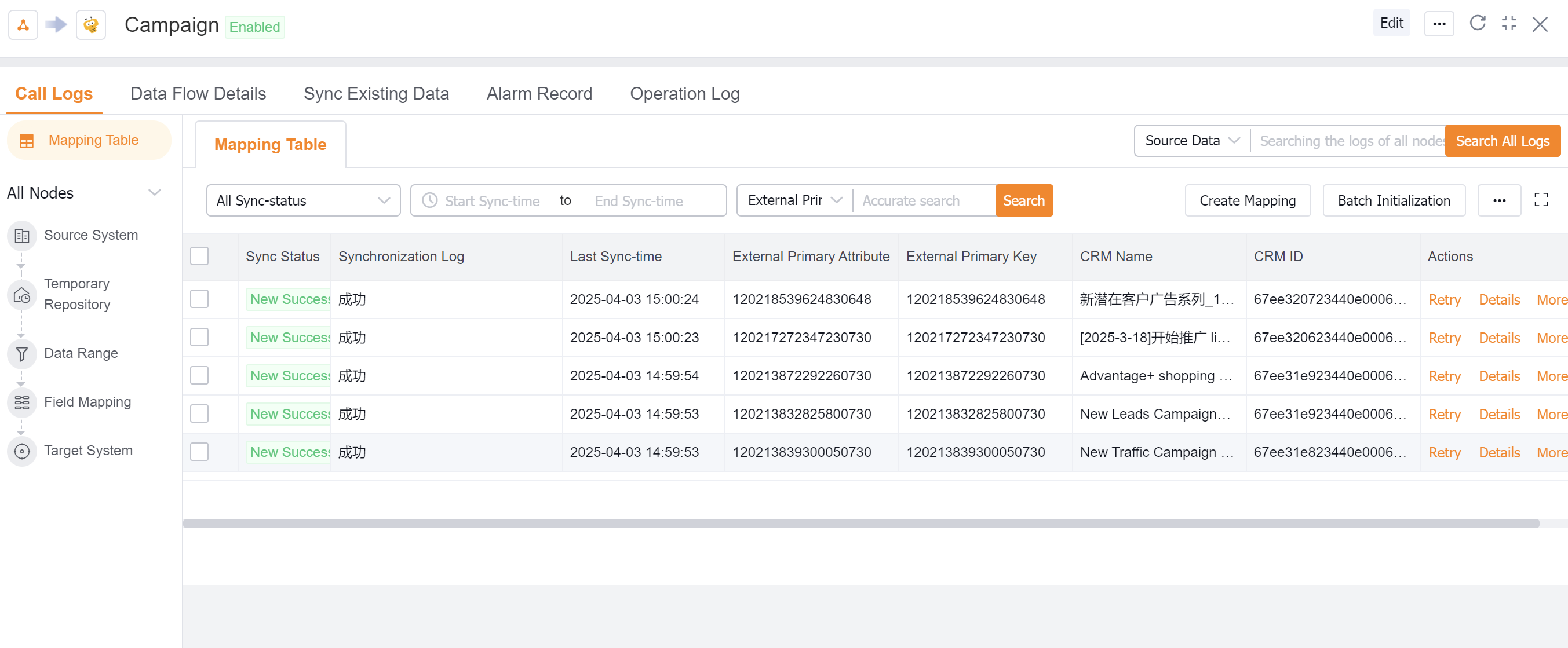 新增数据或者同步历史数据后即可看到数据的同步记录: