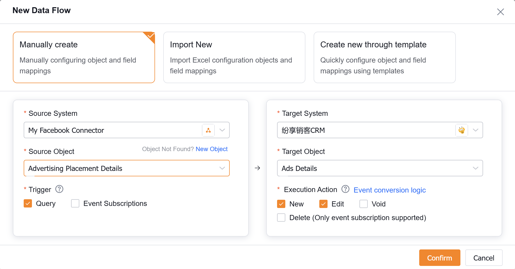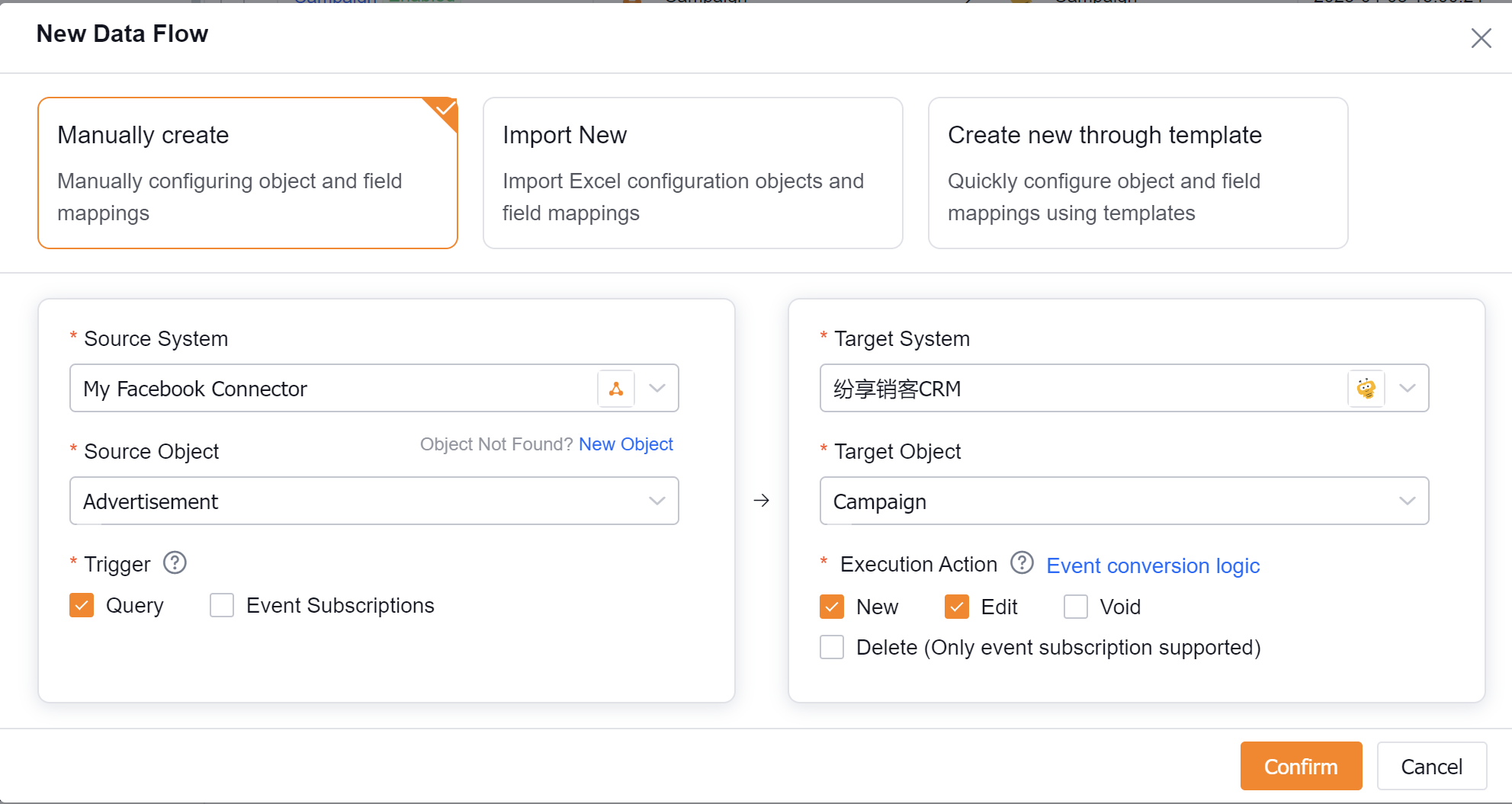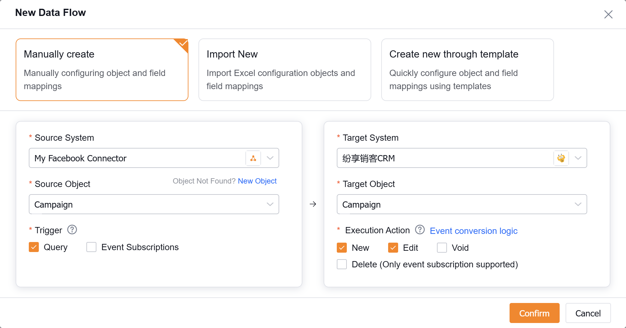 左侧通过 Data Flow 菜单进入集成流新建界面,点击上方的 New Data Flow 按钮,配置集成流。如广告系列从Facebook同步到ShareCRM,左侧 Source System 选择My Facebook Connector(此处的名字为3.3.1设置的连接器名字),Source Object 选择 Campaign ,右侧 Target System 选择ShareCRM,Target Object 选择 Campaign 对象,并且勾选下方的执行动作后,点击 Confirm。