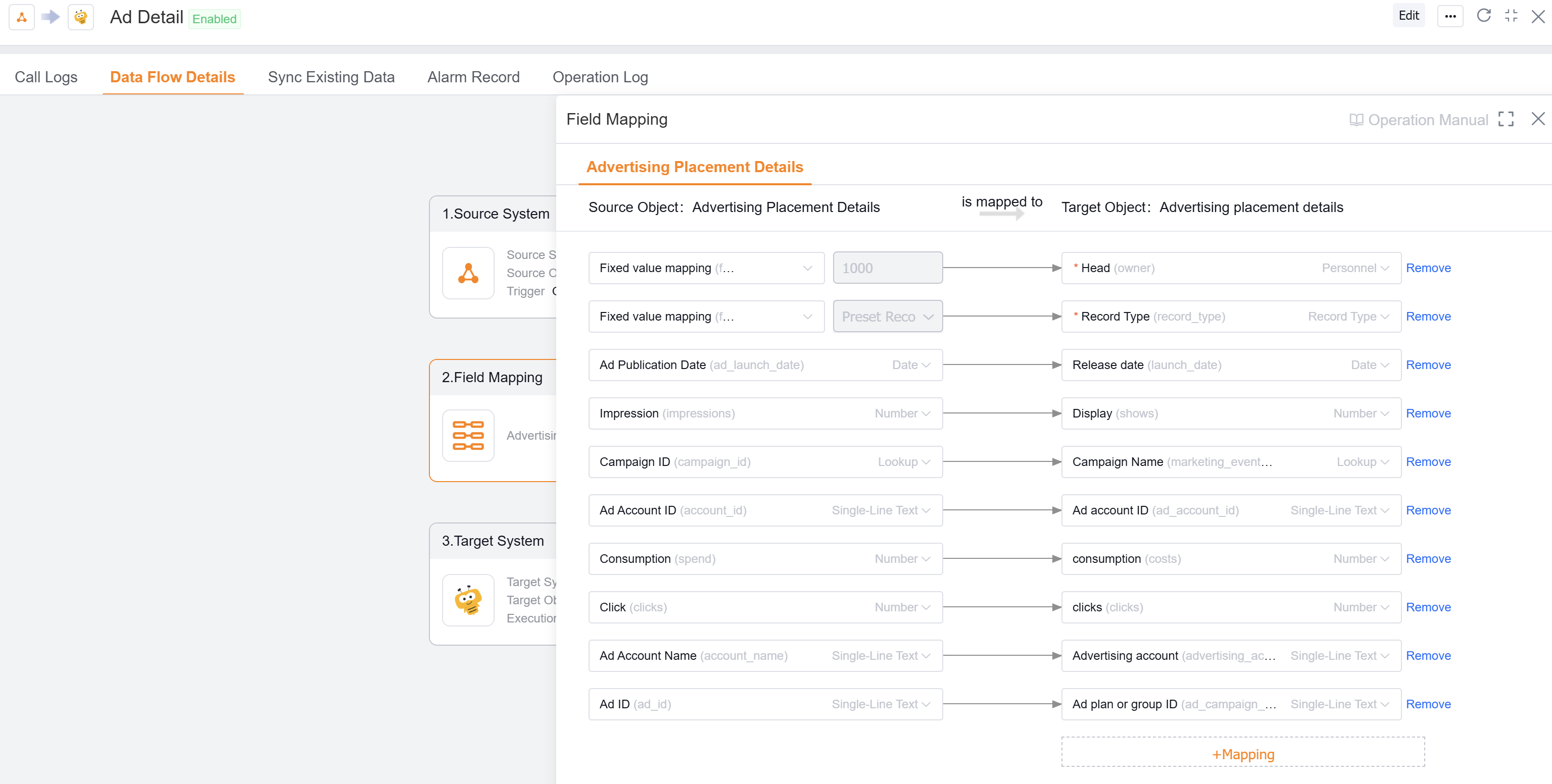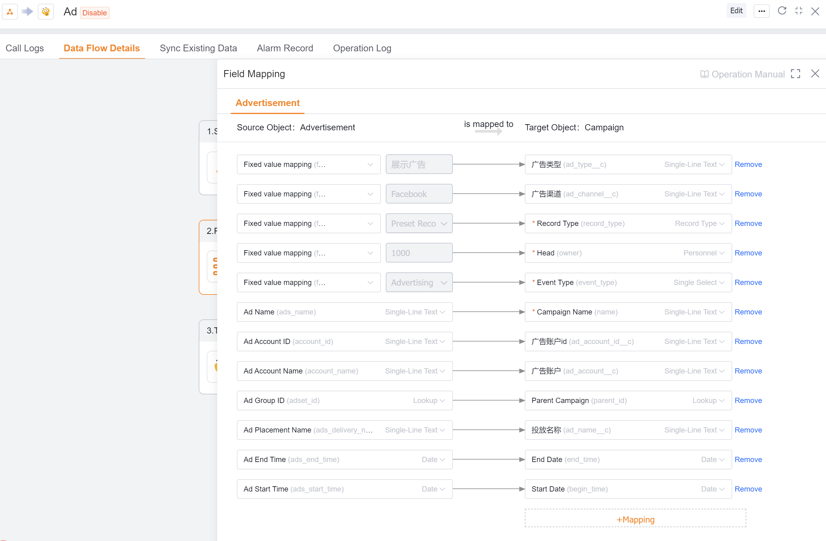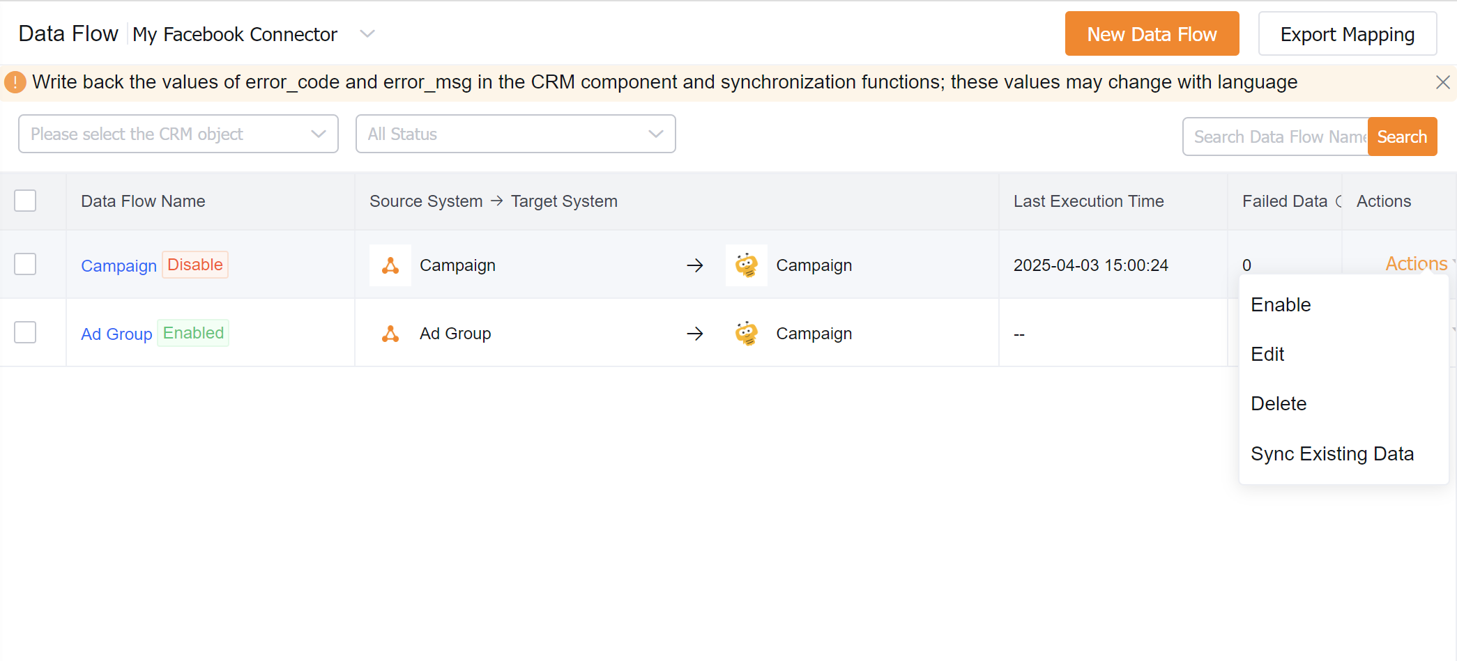 左侧通过 Data Flow 菜单进入集成流新建界面,点击上方的 New Data Flow 按钮,配置集成流。如广告系列从Facebook同步到ShareCRM,左侧 Source System 选择My Facebook Connector(此处的名字为3.3.1设置的连接器名字),Source Object 选择 Campaign ,右侧 Target System 选择ShareCRM,Target Object 选择 Campaign 对象,并且勾选下方的执行动作后,点击 Confirm。