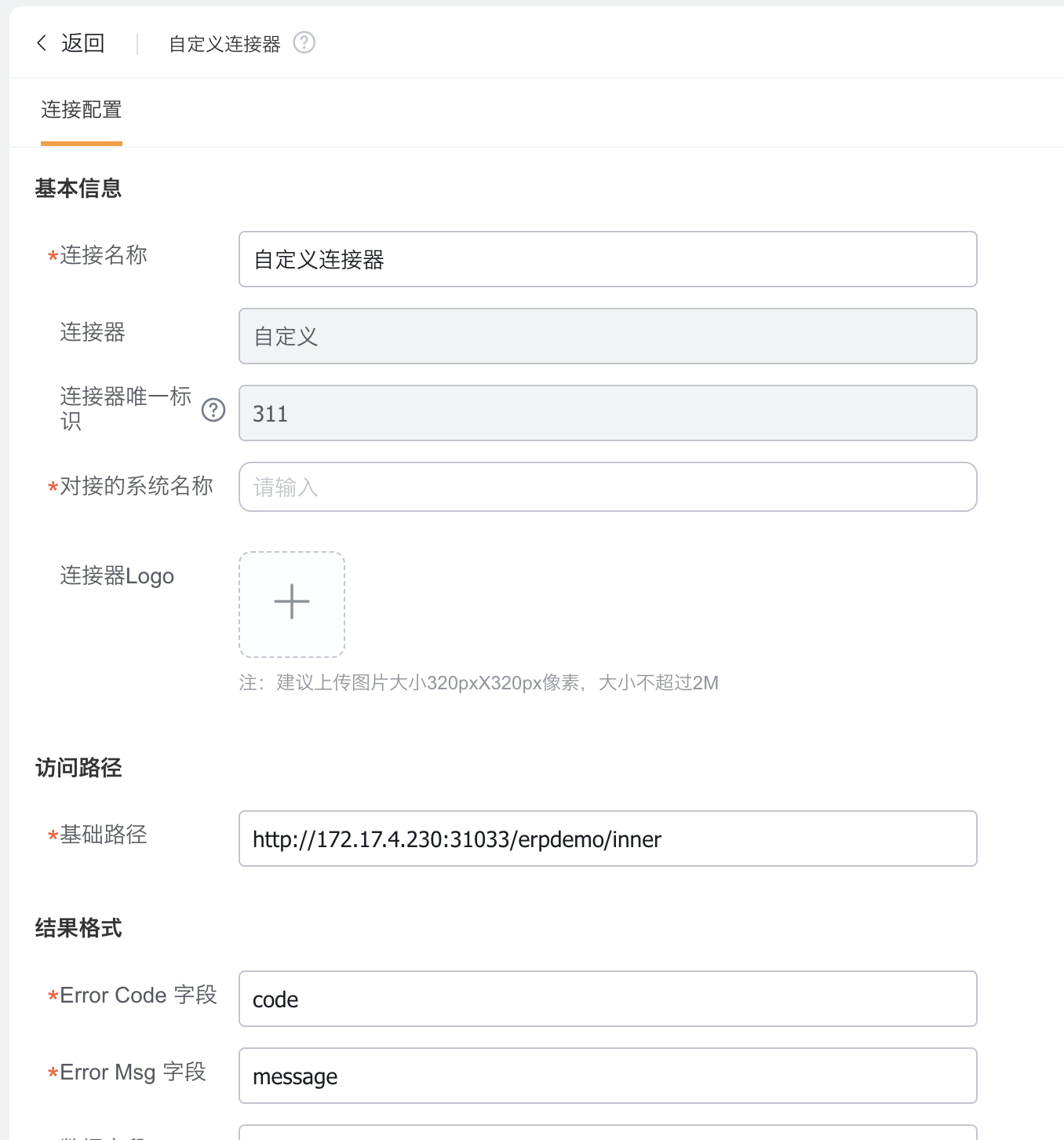 新建连接器,连接器类型选择自定义连接器,填写连接器信息: