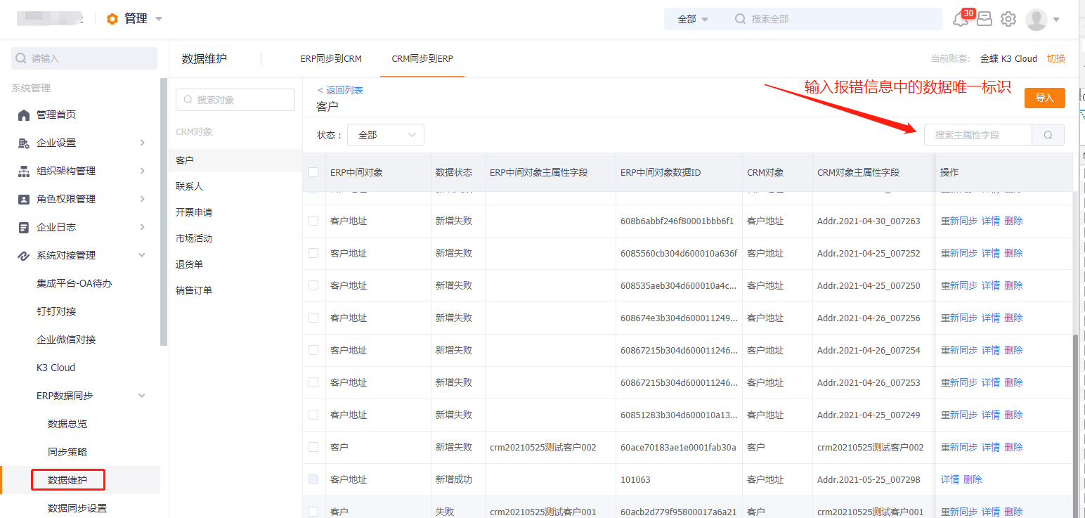在依赖对象的数据维护里面搜索报错的数据唯一标识