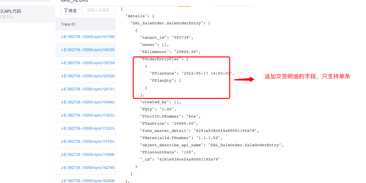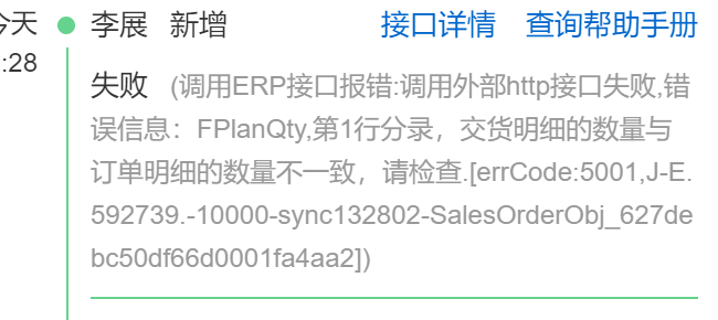(调用ERP接口报错: 调用外部http接口失败,错误信息:FPlanQty,第1行分录,交货明细的数量与订单明细的数量不一致,请检查.[errCode:5001,J-E.592739.-10000-sync142408-SalesOrderObj_627df9760df66d000144a3fe])处理步骤:
