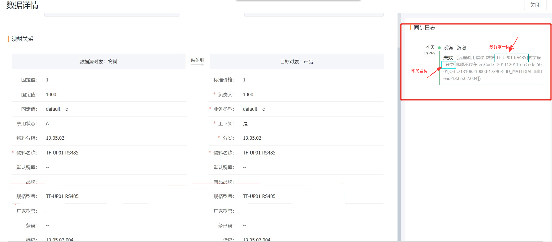 物料对象请到 管理->ERP数据同步->数据同步设置->系统字段管理,检查产品分类字段的数据映射中,你选择的分类选项是否有映射,如果没有,则导入映射关系-可参考用户手册【3.4.4.1产品分类维护】;