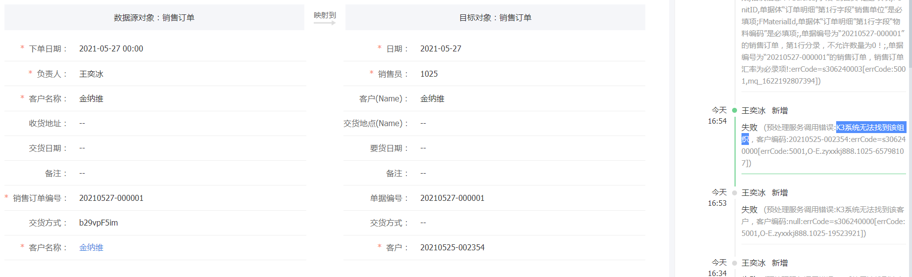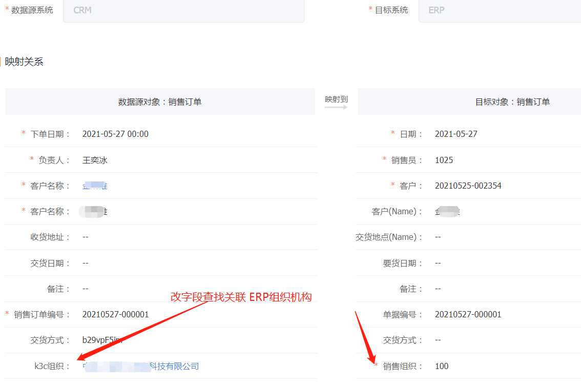 要在订单上对象上新加一个查找关联字段,查找关联CRM上 "ERP组织机构“对象, 然后该字段也要做配置字段映射。