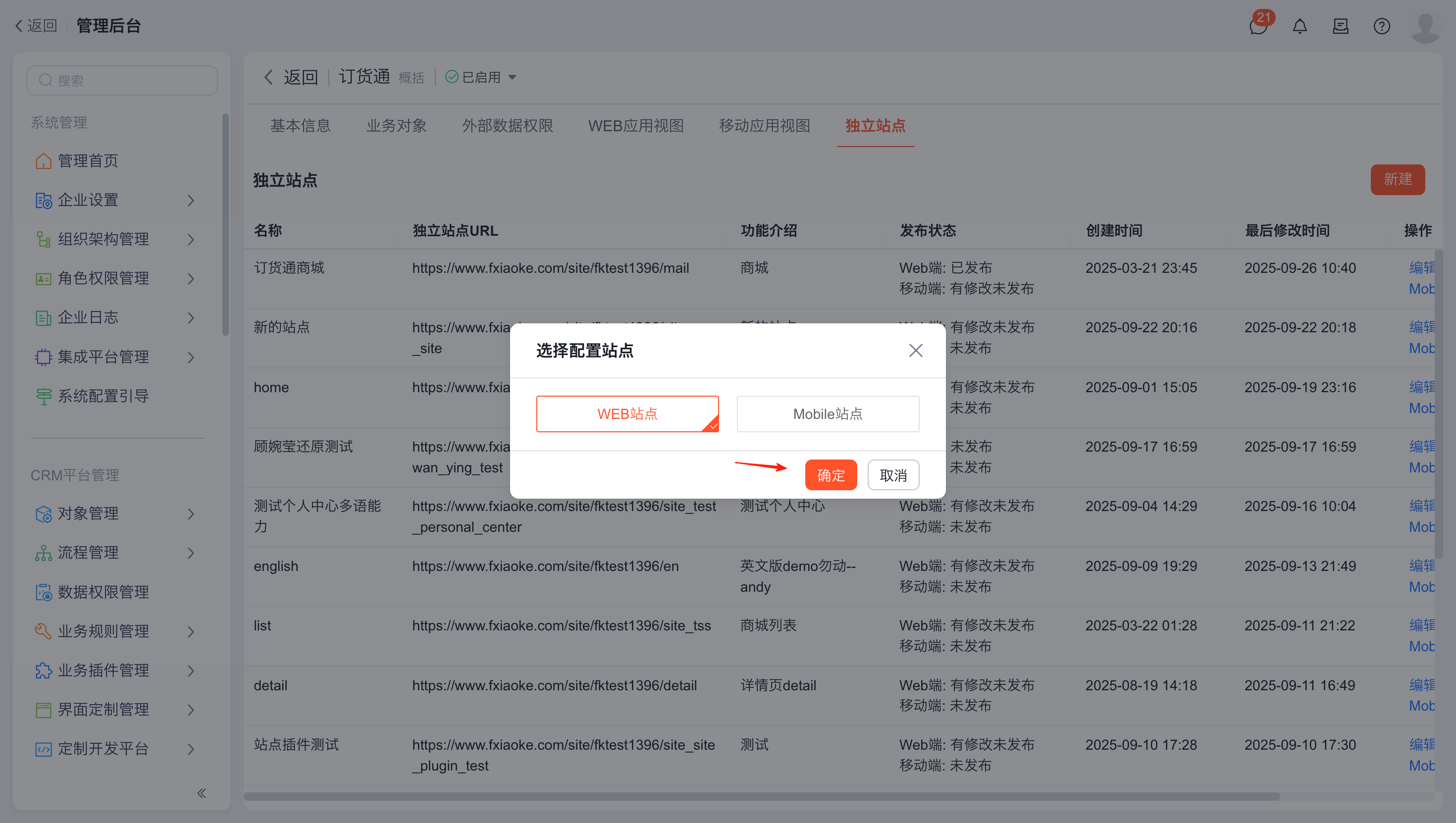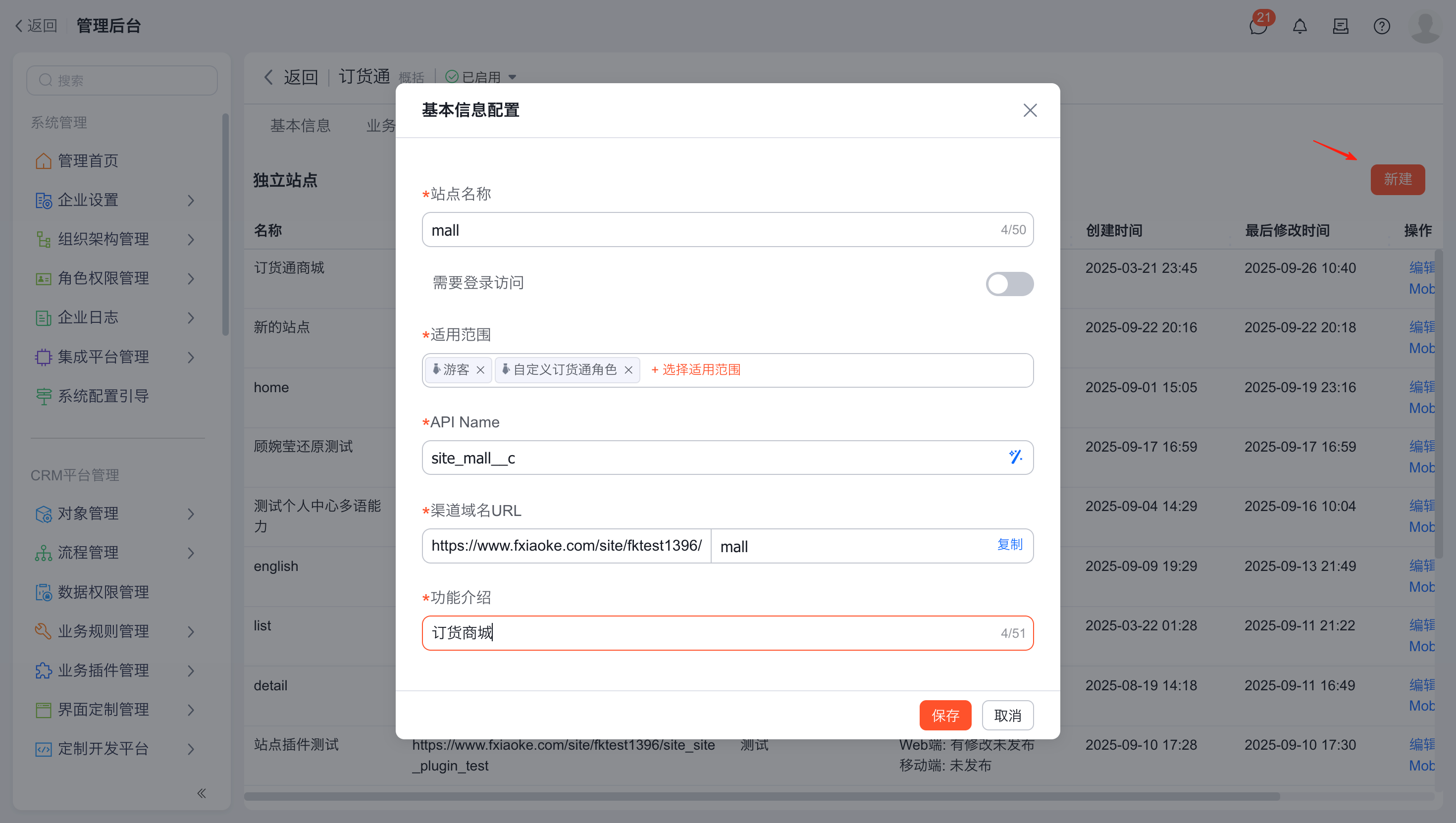 1、在订货通的配置中,新建站点门户,维护基本信息:站点名称、是否需要登录访问、适用范围