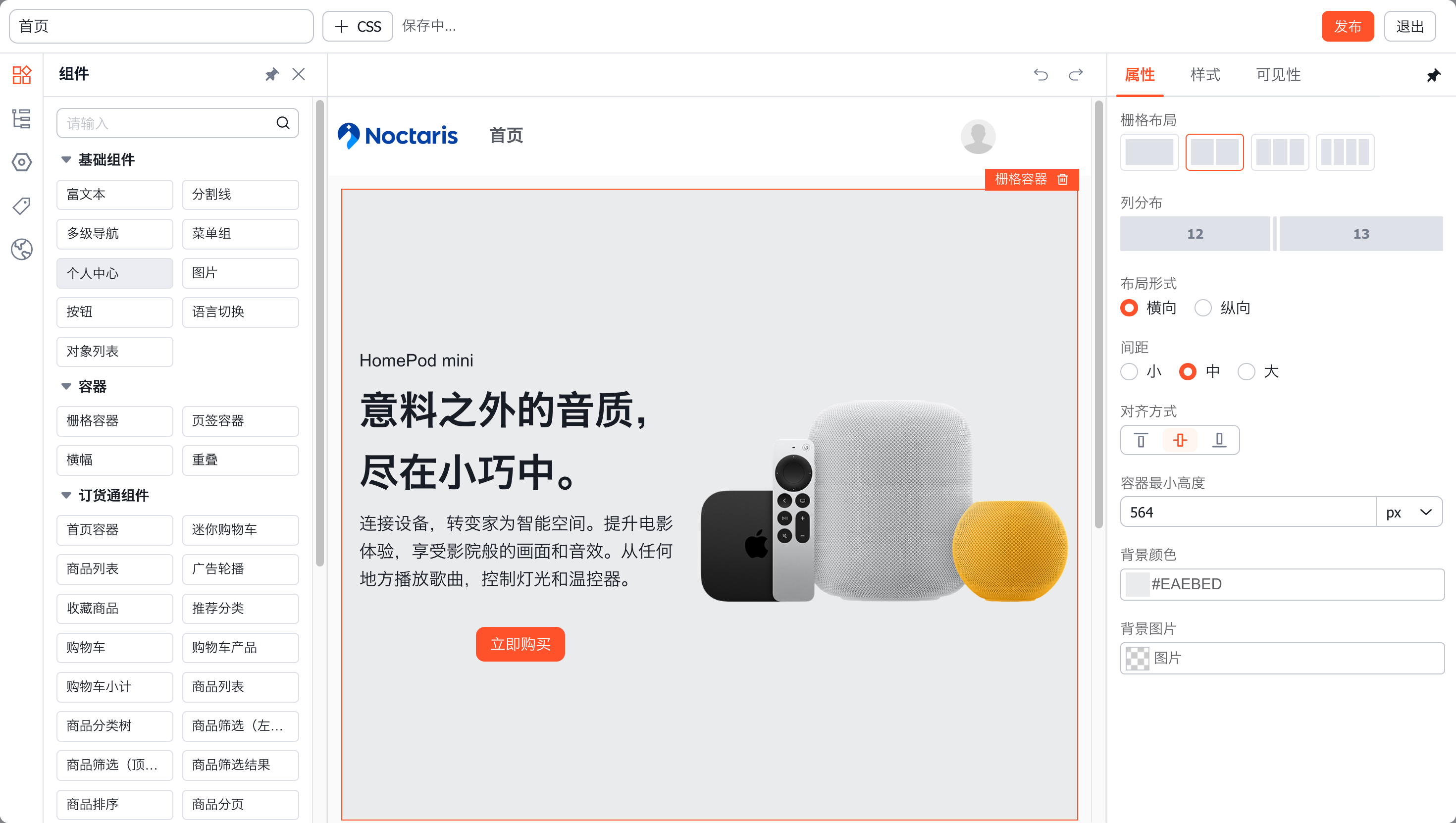 4、配置首页区域:一般用到栅栏容器、图片、按钮、商城列表(订货通组件放在首页容器里面)等