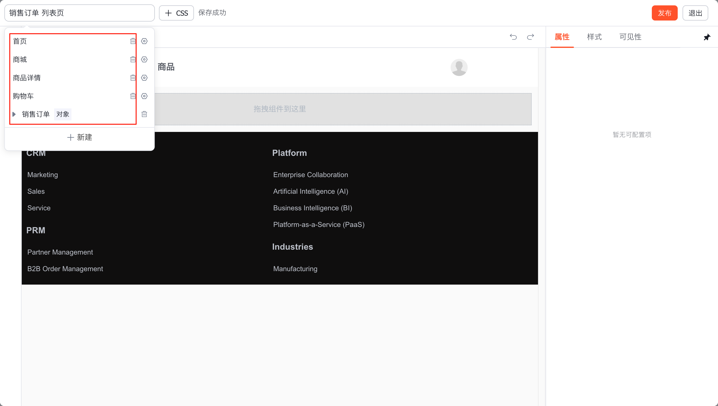 2、点击操作【WEB站点】进入web门户配置页面,根据需要配置页面和组件,并在主导航菜单中配置显示出来