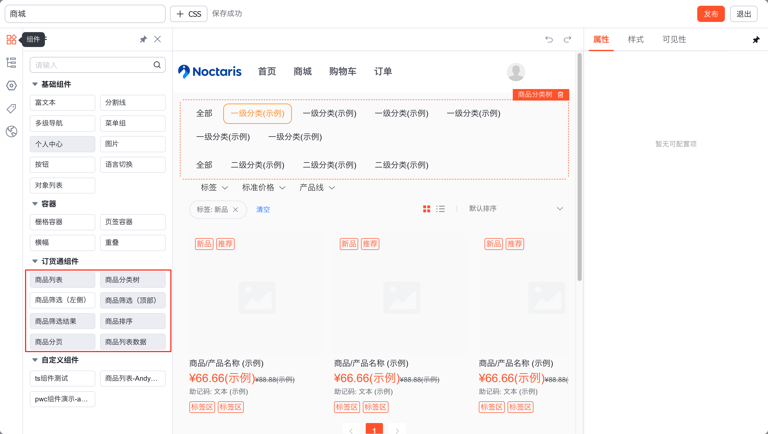 订货通商品组件:商品列表、商品分类数、商品筛选(左侧)、商品筛选(顶部)、商品筛选结果、商品排序、商品分页、商品列表数据