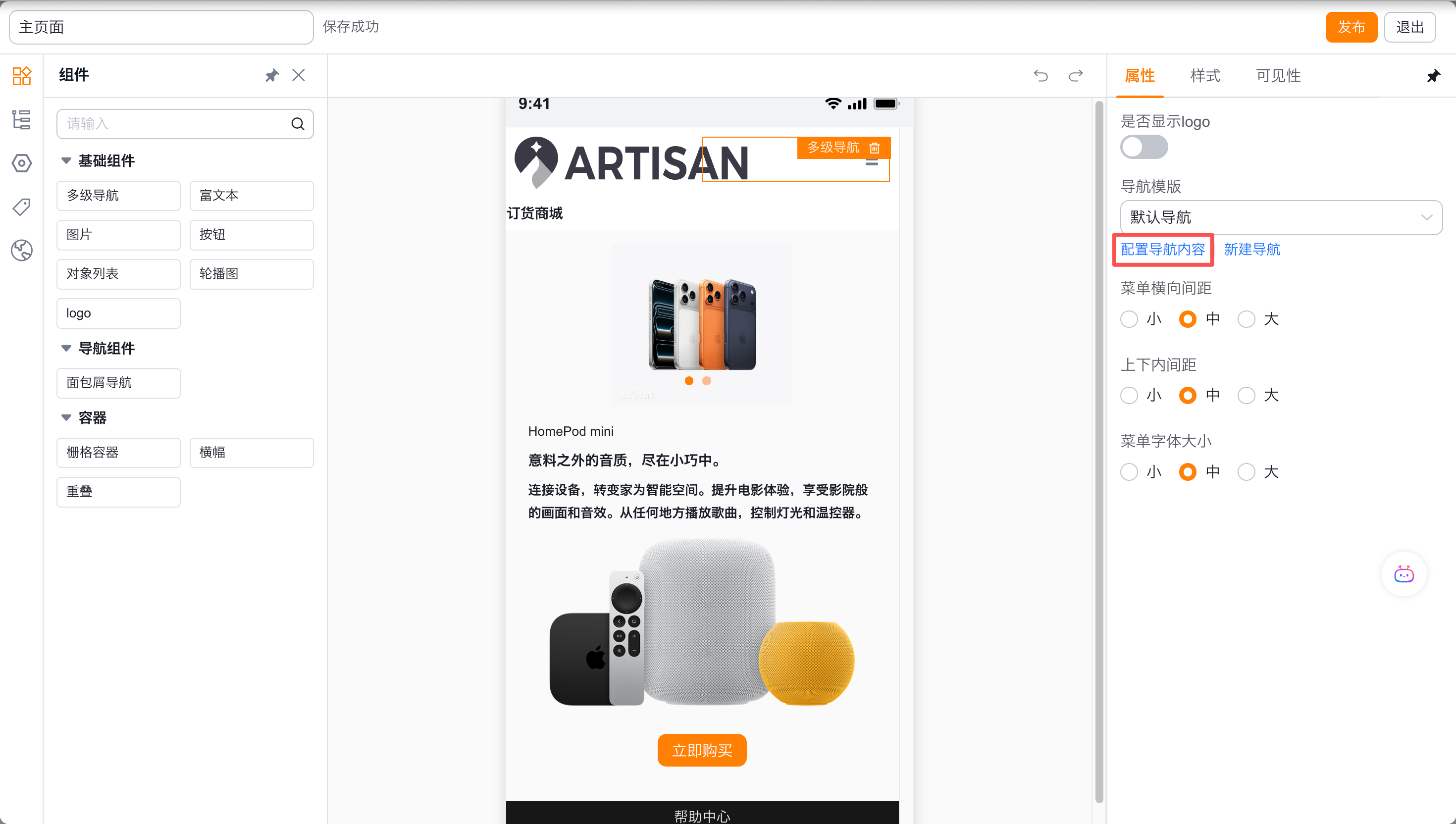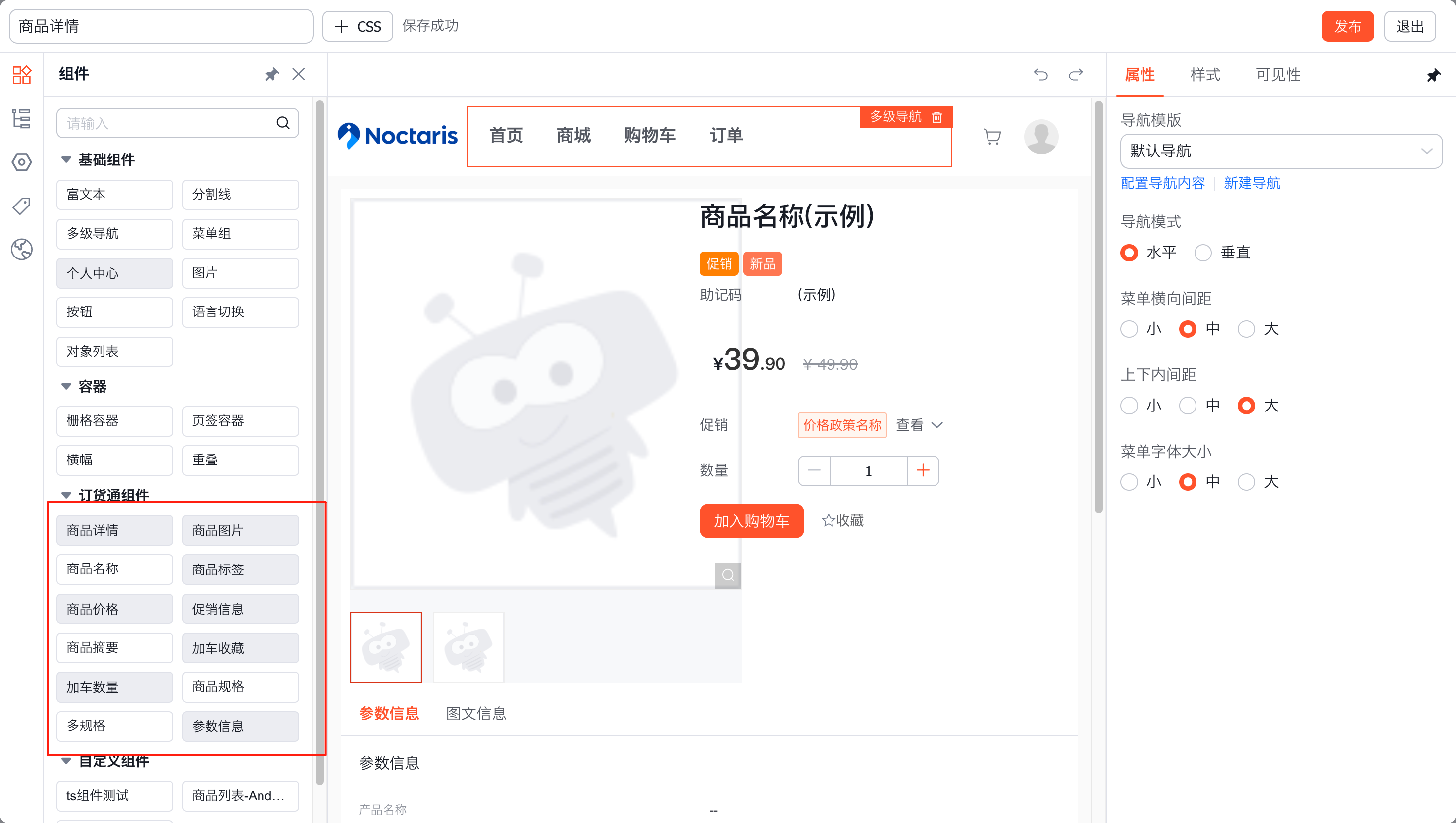 多级导航:除了首页、新建几个站内页面、例如:商城、商品详情、购物车、订单;通过配置导航内容新建菜单项绑定站内页面