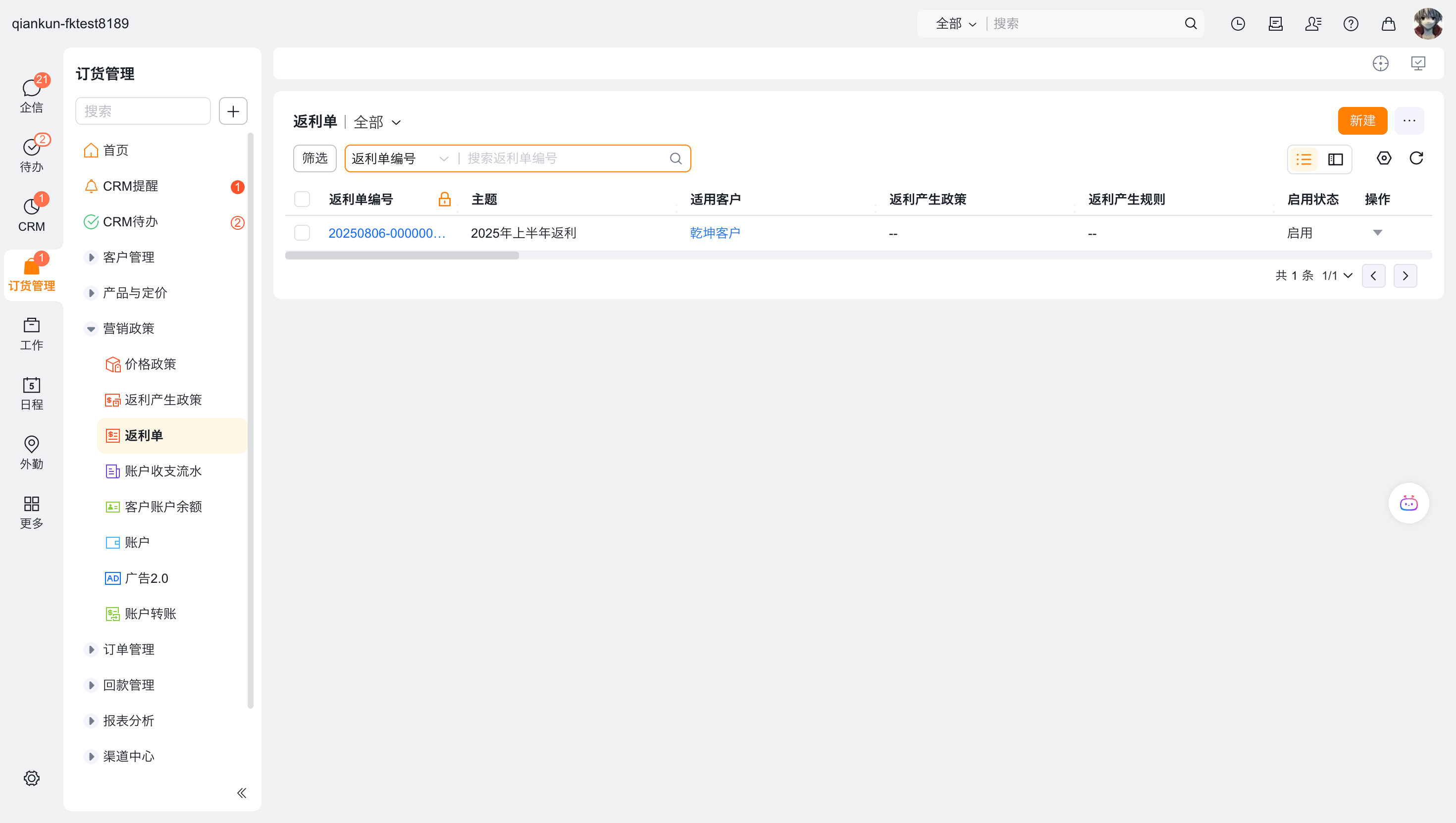 客户账户启用后,返利也就可以使用了,返利支持返金额、返产品。