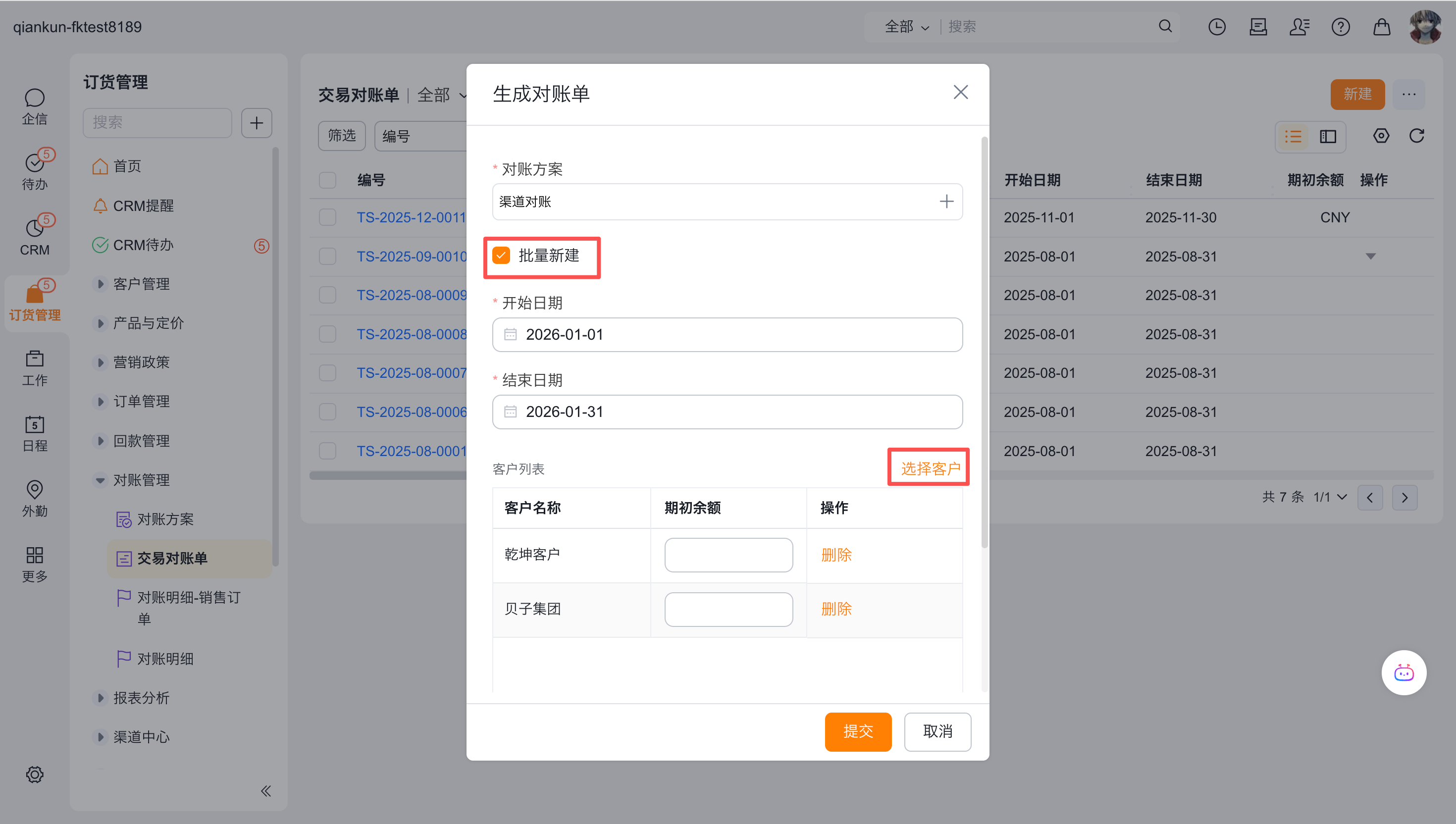 完成以上所有配置后,即可在crm中搜索【交易对账单】,点击【新建】,可选择客户、时间范围、输入期初余额生成对账单。