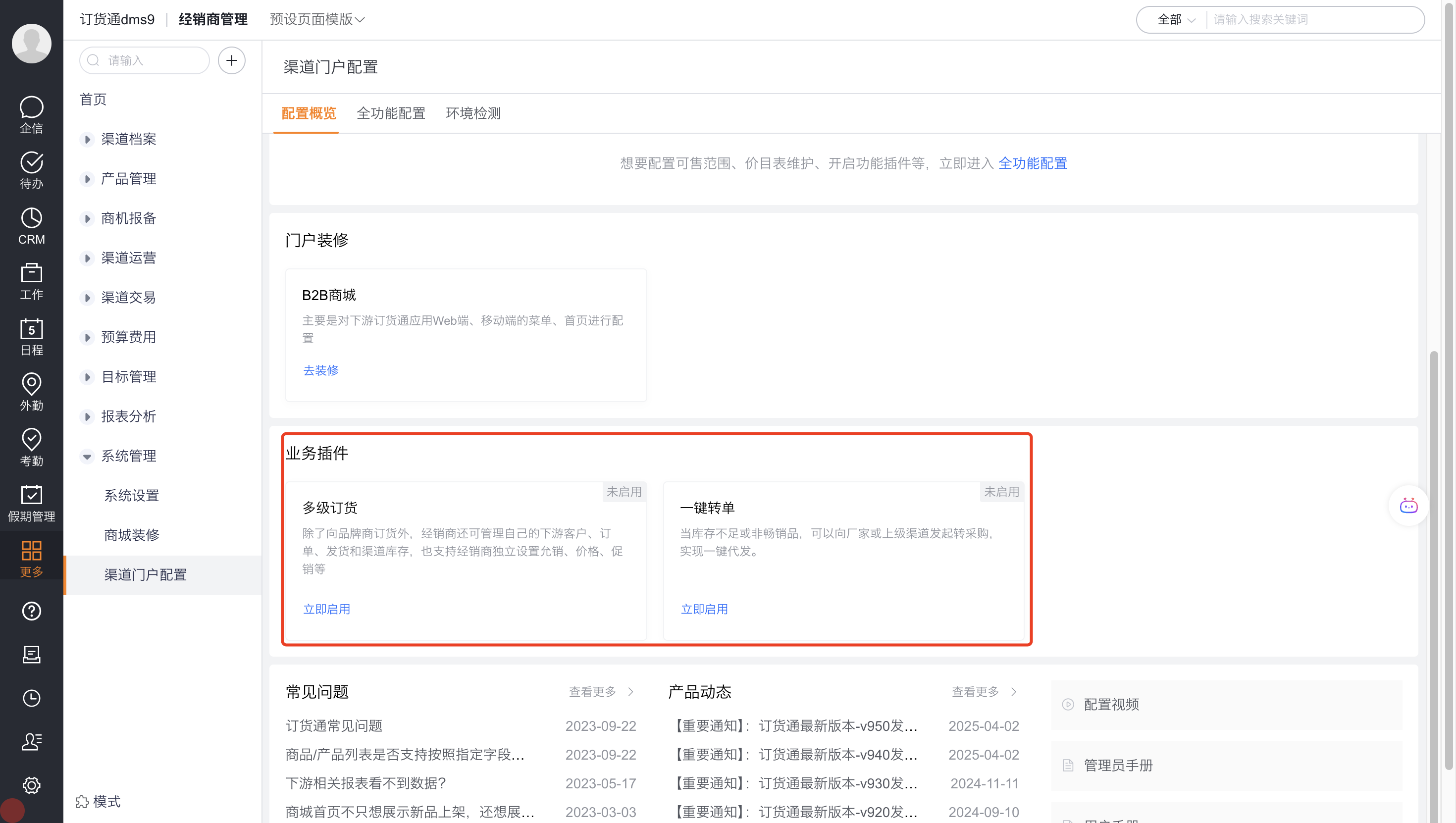1)购买制造业渠道分销DMS后,在管理后台【CRM平台管理】-【业务规则设置】-【经销商管理】菜单中,就可以看到制造业DMS相关介绍。点击【立即启用】,进行系统初始化,系统预设【经销商管理】、【经销商门户】应用,以及相关的对象、字段和布局。