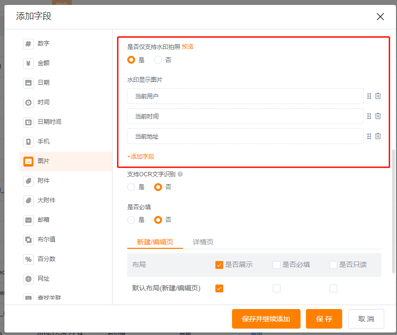 - 图片字段支持水印拍照,水印内容支持自定义