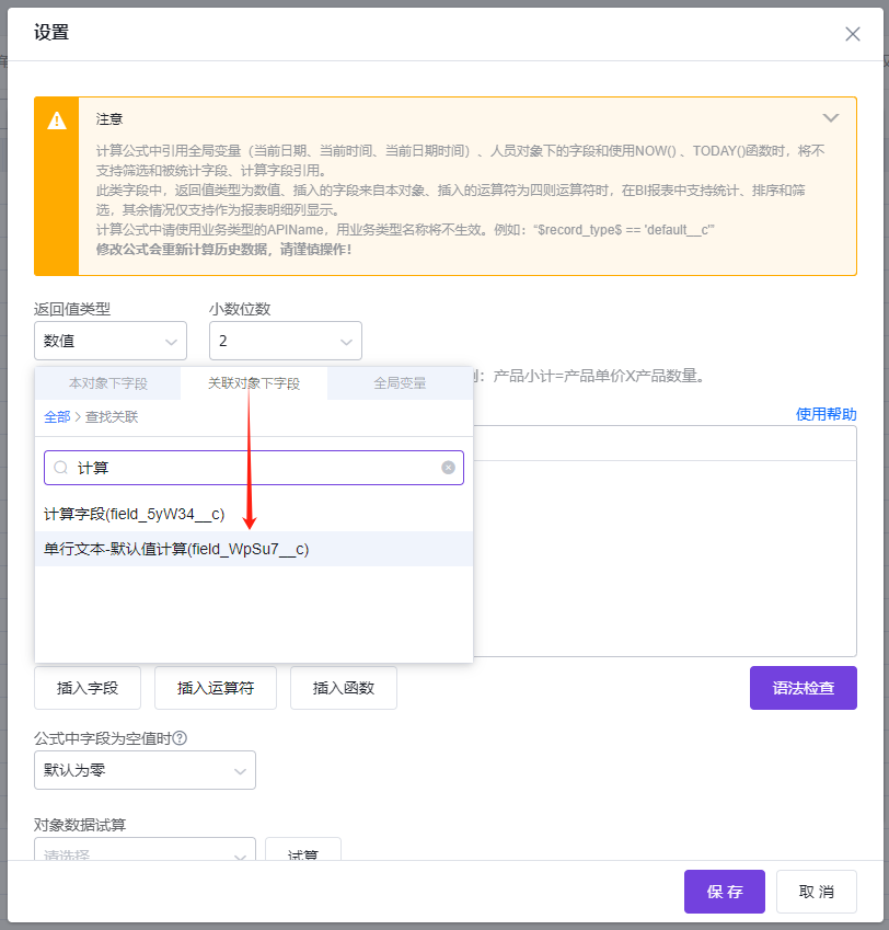 计算字段,统计字段,默认值计算公式不可选择引用字段进行计算和统计。
