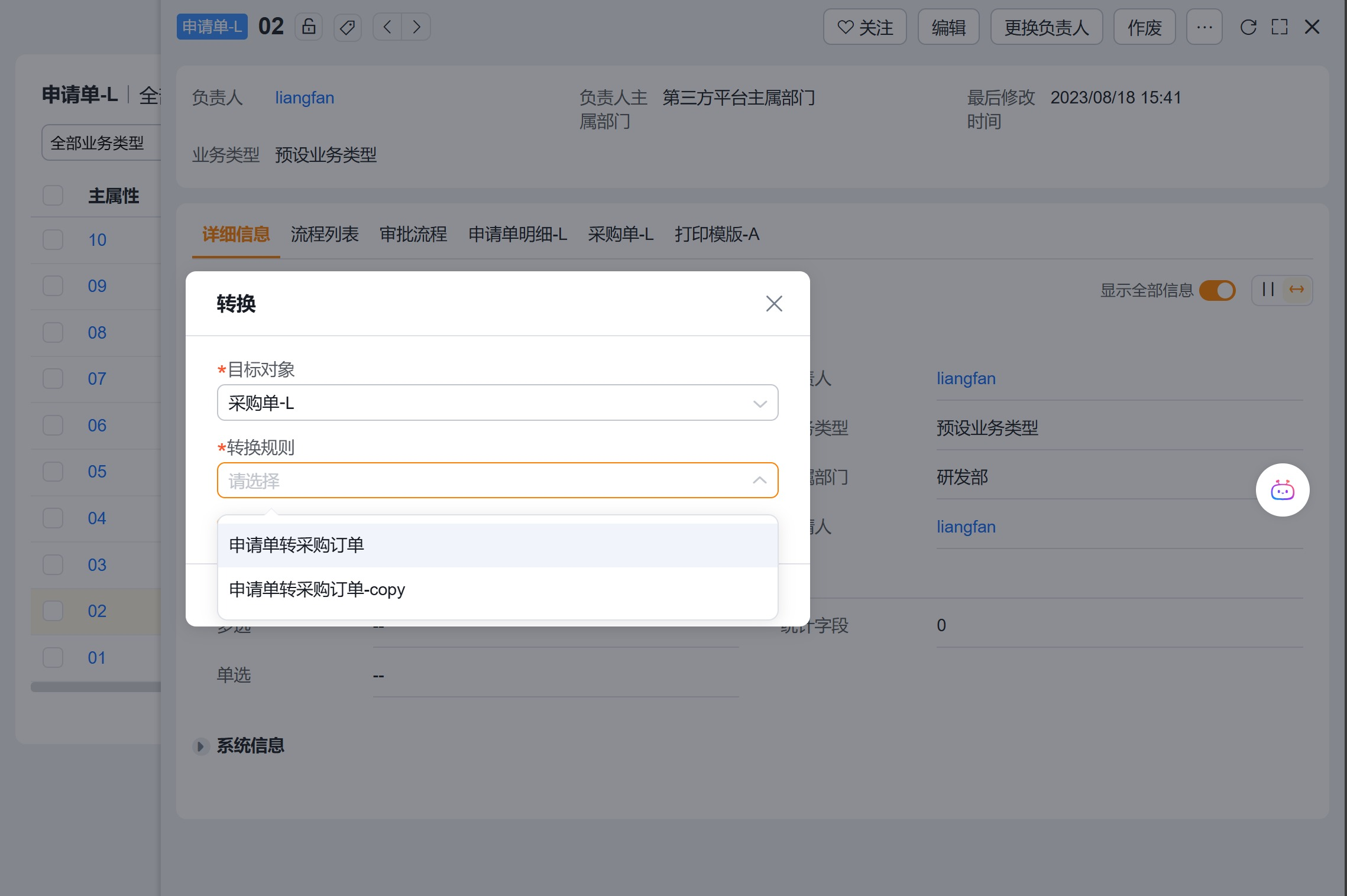 - 若有多个转换关系,则会弹窗展示选择转换的对象
