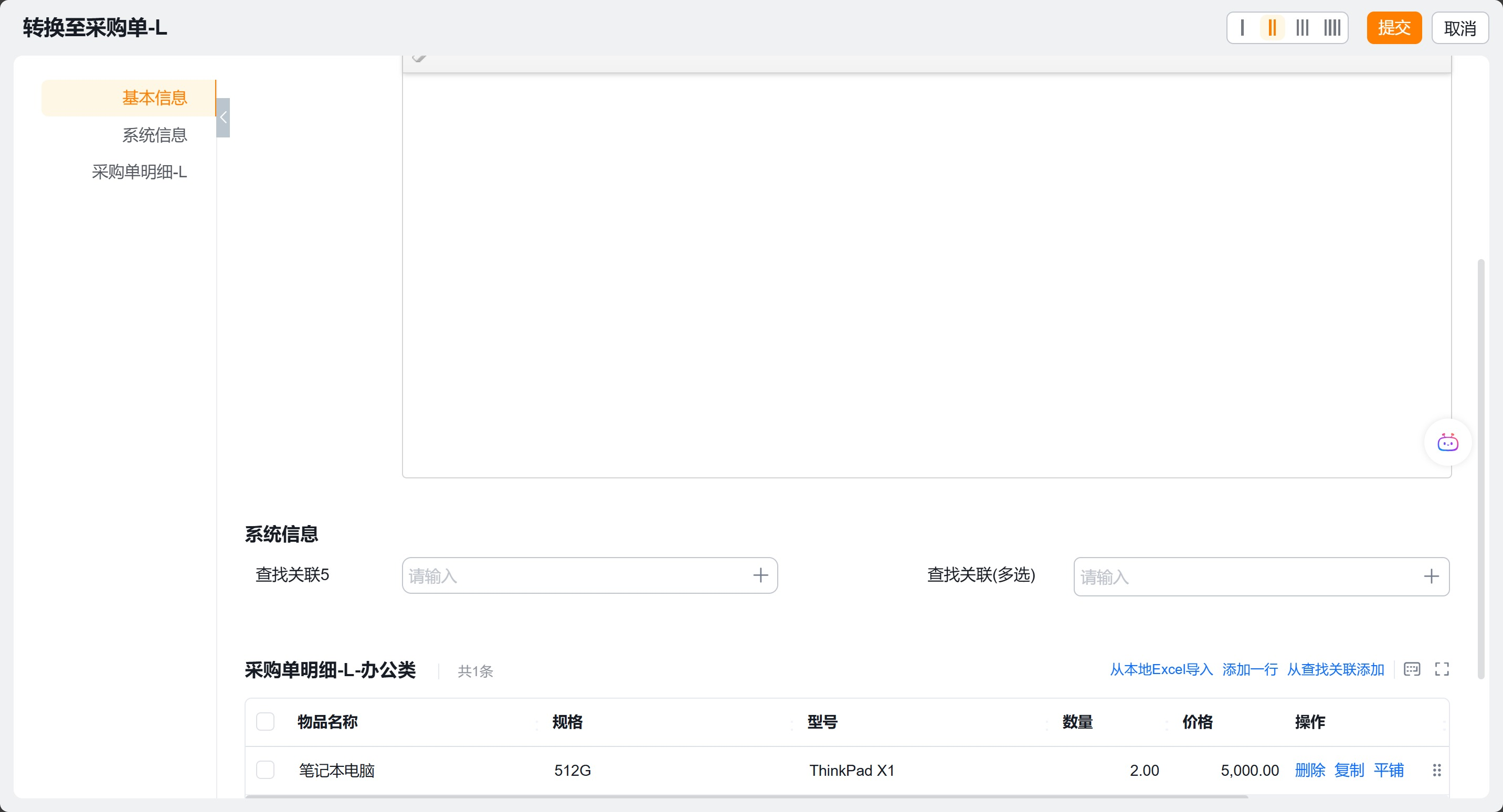 - 对应关系:采购申请->采购订单 采购申请明细->采购订单明细 。