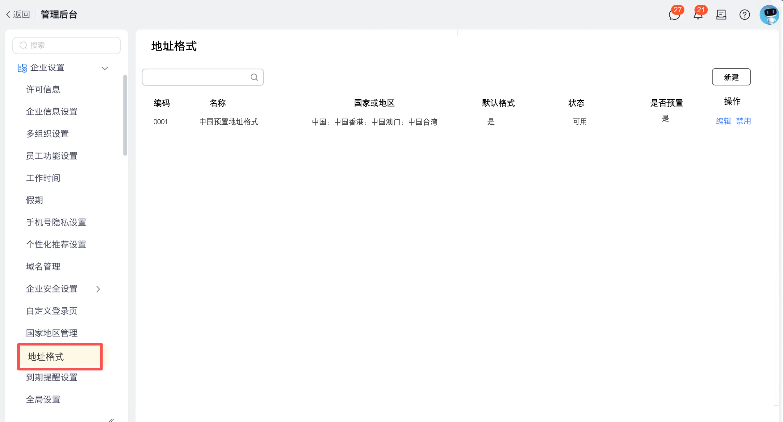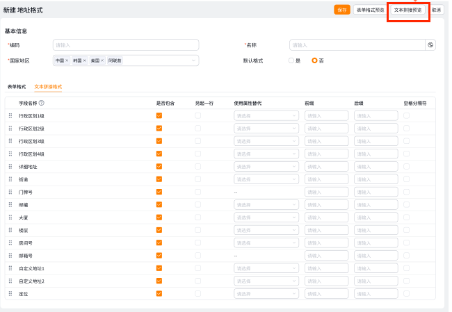 - 系统已预置中国及港澳台、国际标准地址格式,可直接使用或基于其修改