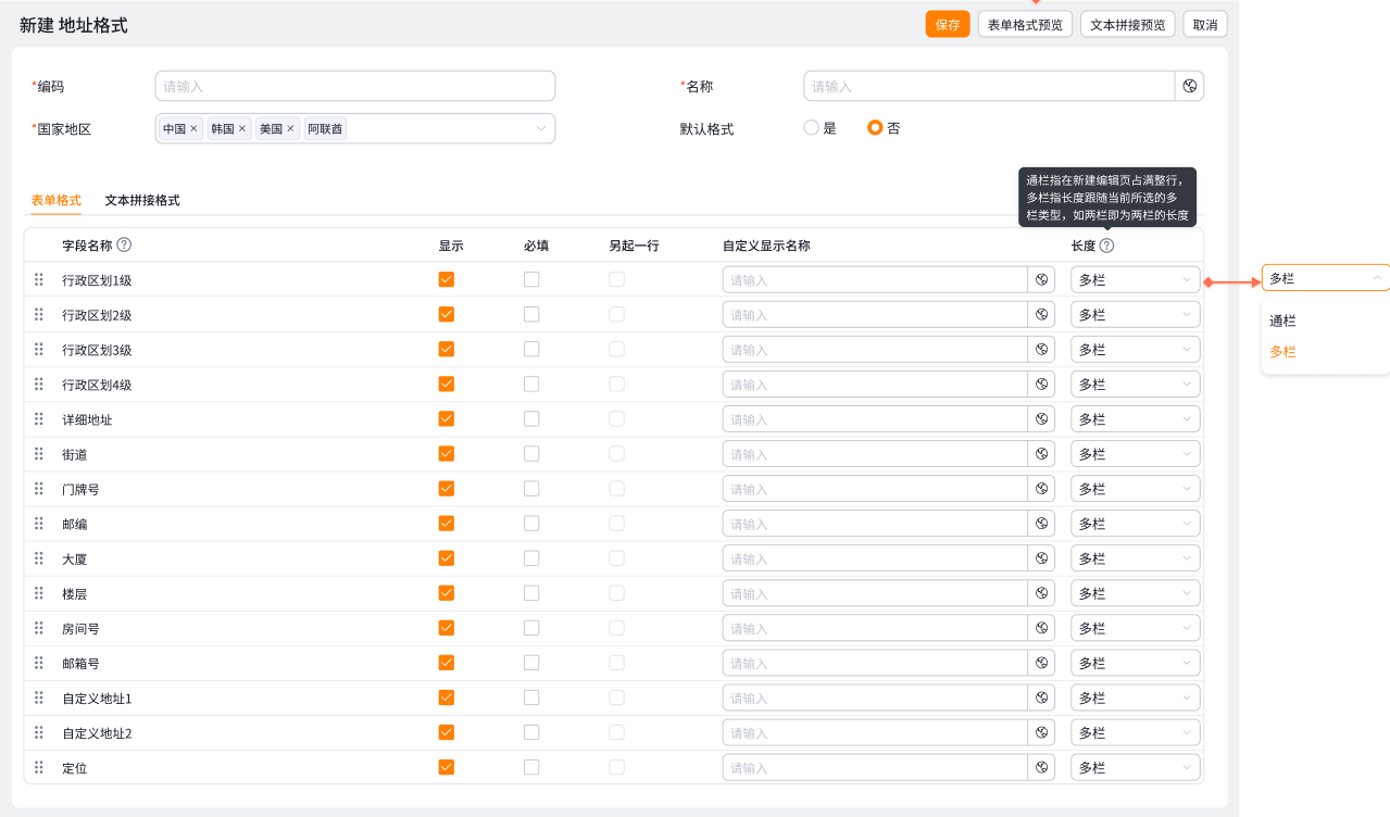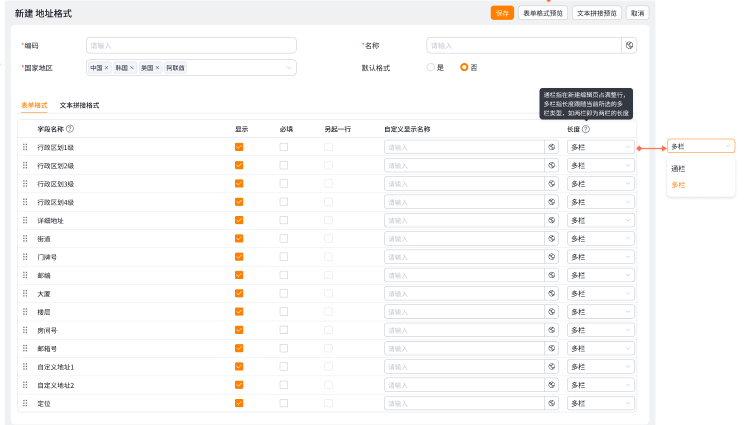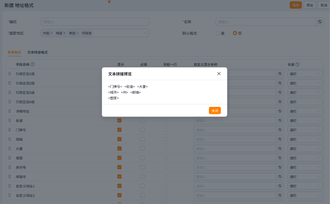 - 同一国家 / 地区仅允许一个默认地址格式,重复设置会报错