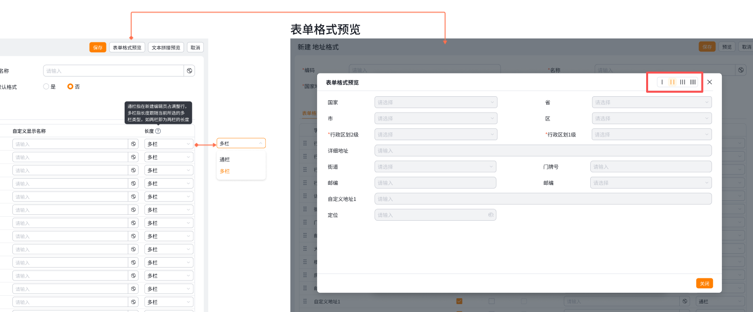 - 使用【预览】功能,可模拟新建编辑页和详情页布局中的显示效果,切换 1/2/3/4 列布局,实时查看配置效果。显示的字段名称为地址格式规则中定义的显示名称,例如::地址格式中定义了在美国地区“省” 显示名称为 “州”,当国家选择中国时,显示省,选择美国时,显示州