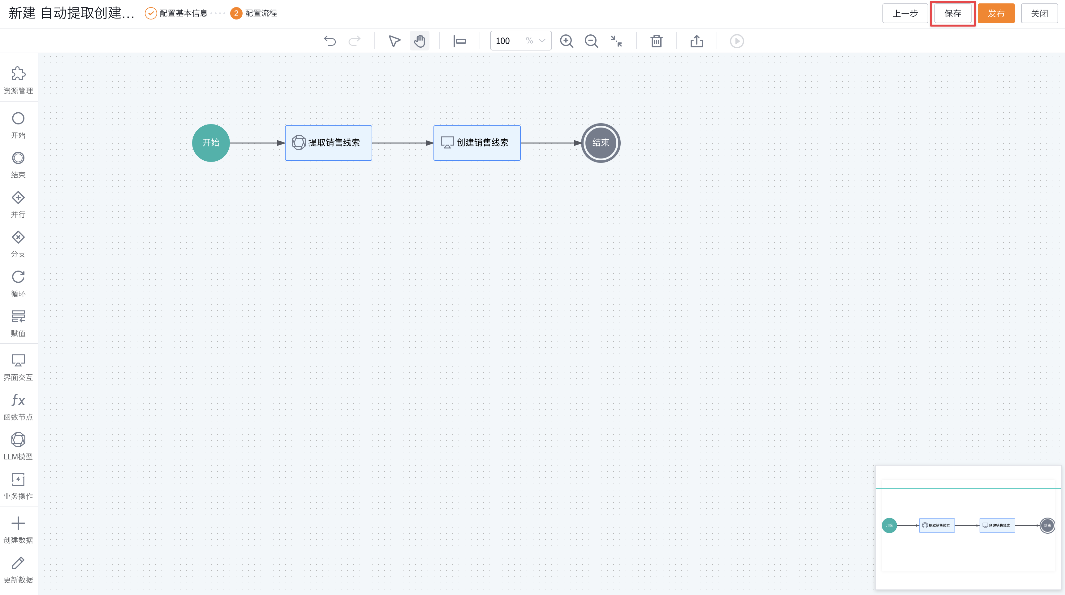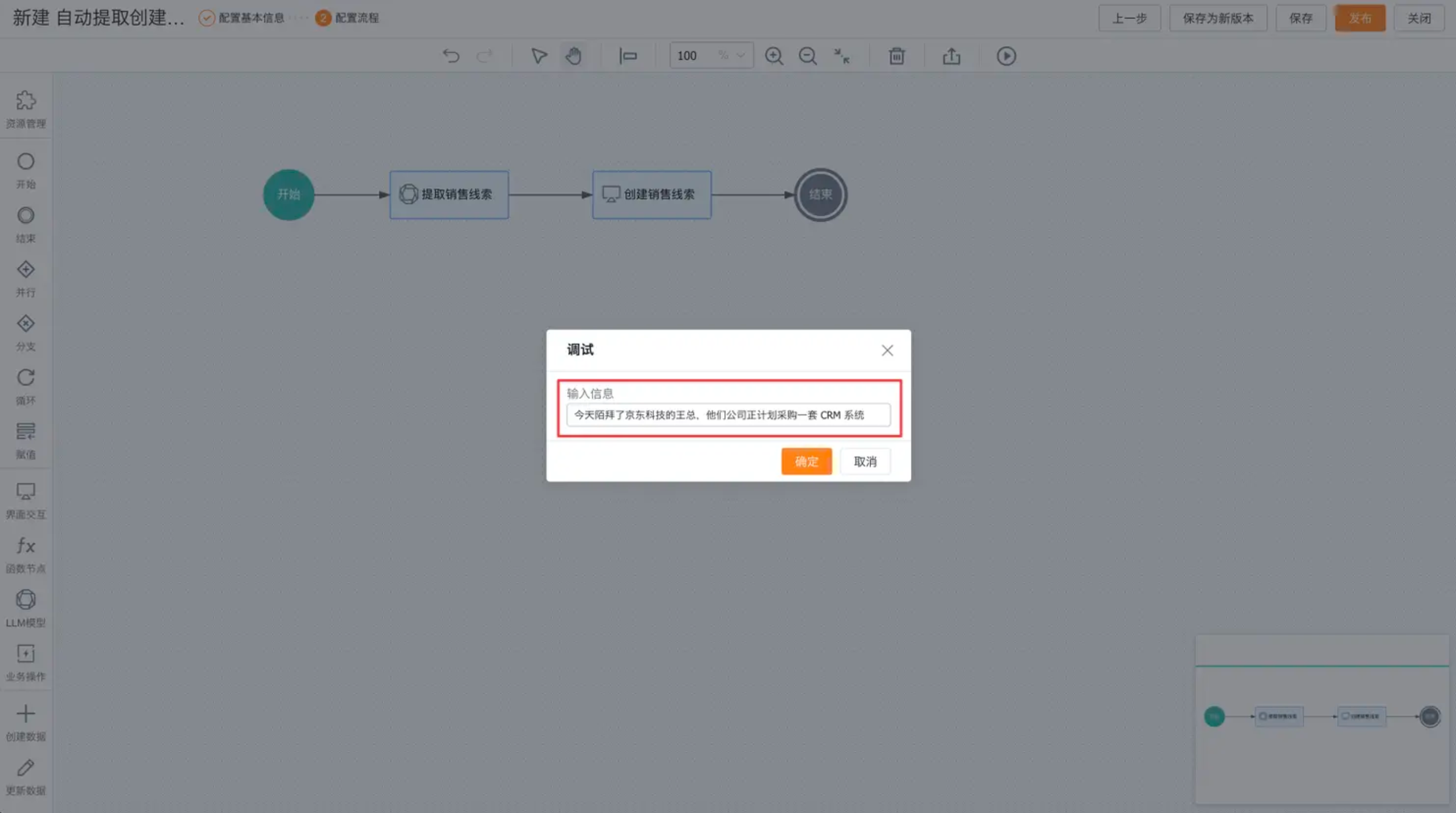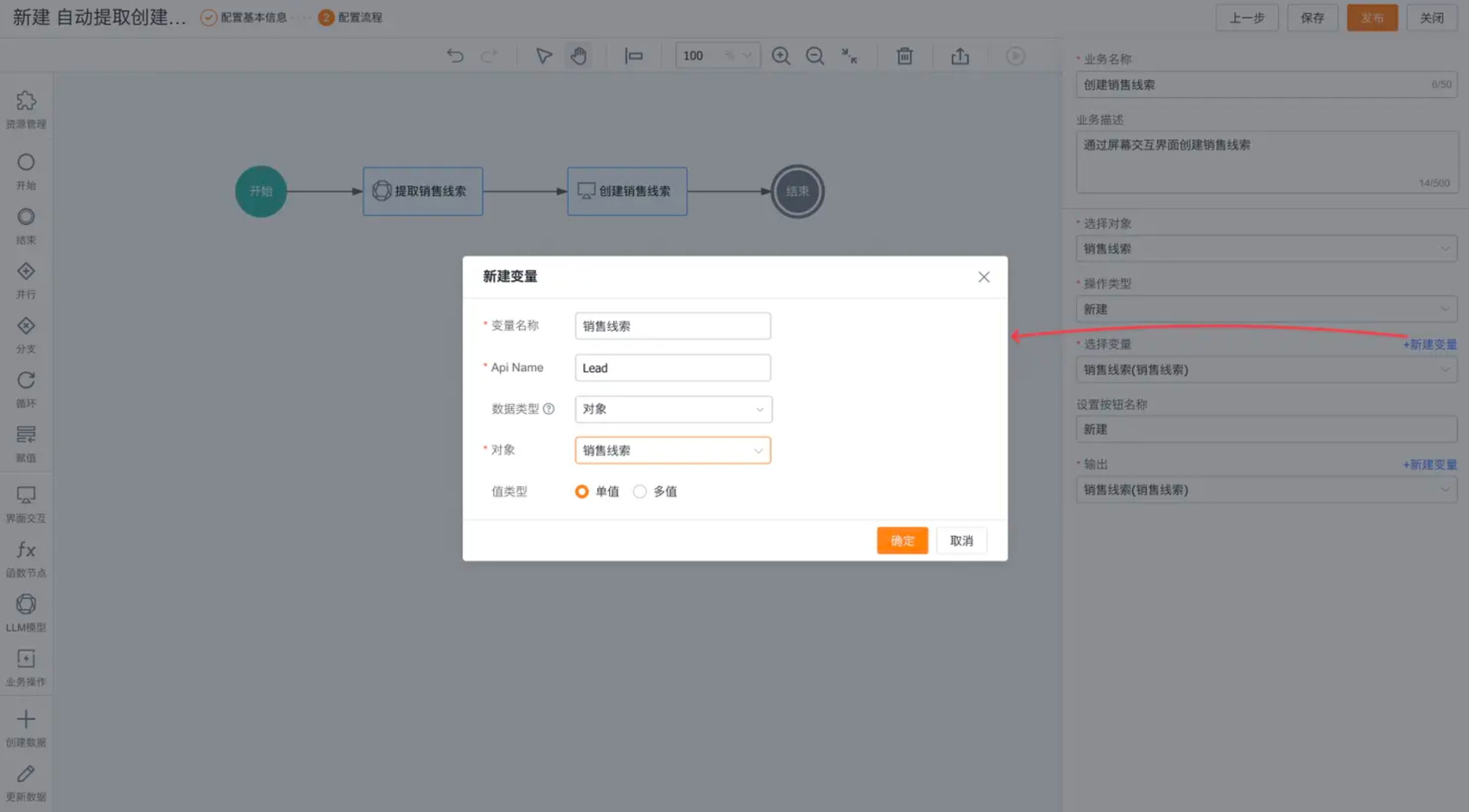 点击工作区的“LLM模型”节点,右侧侧滑显示配置项。选择配置节点的业务名称和业务描述后,配置屏幕交互的对象类型、操作类型,这里选对象为销售线索、操作类型为新建;选择变量:选择上一步创建好的销售线索对象类型变量,输出:选择相同的变量。