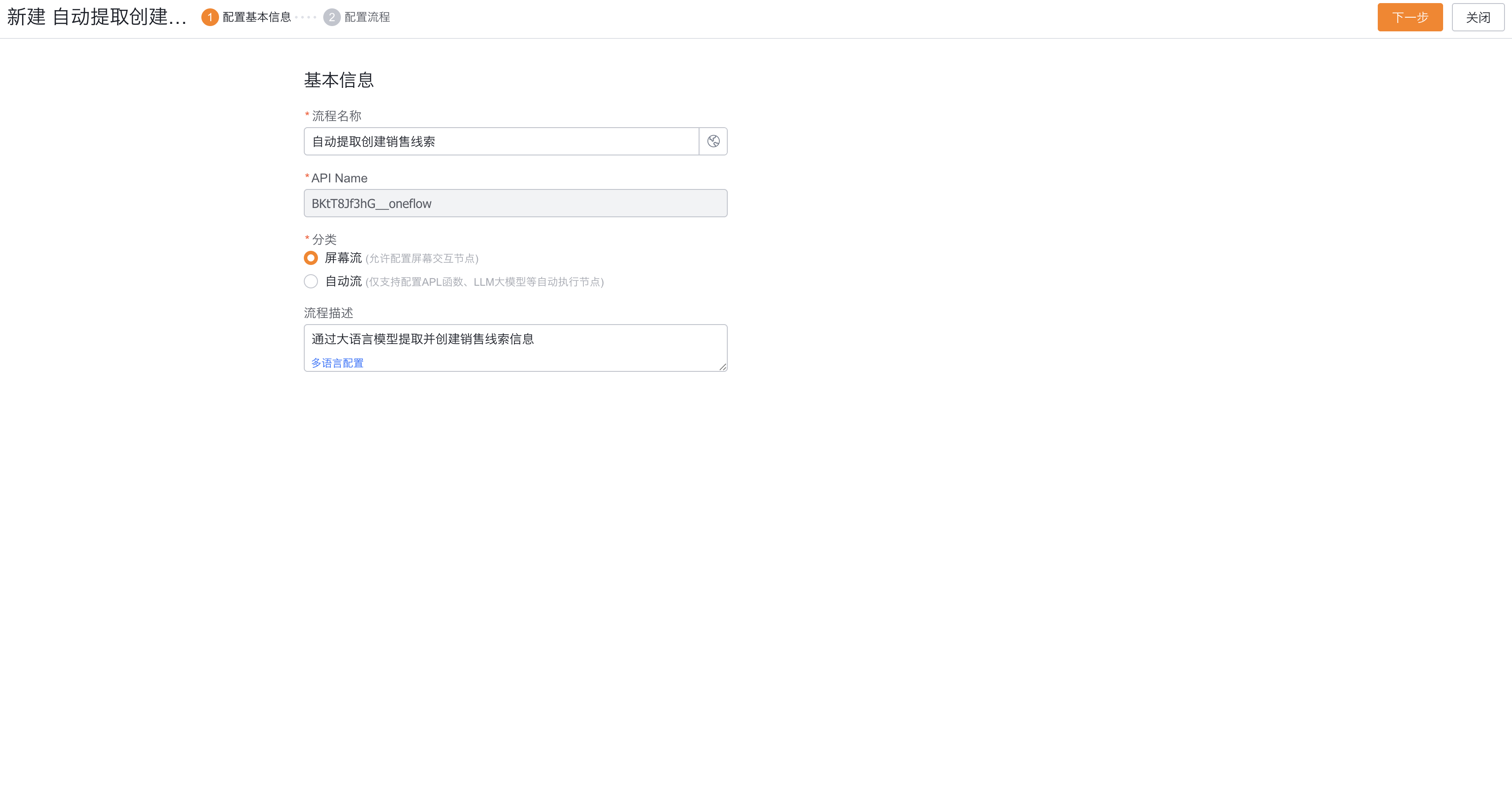 - 第一步:配置基本信息;输入流程名称(必选),选择流程类型(必选),输入流程描述(可选),点击下一步。