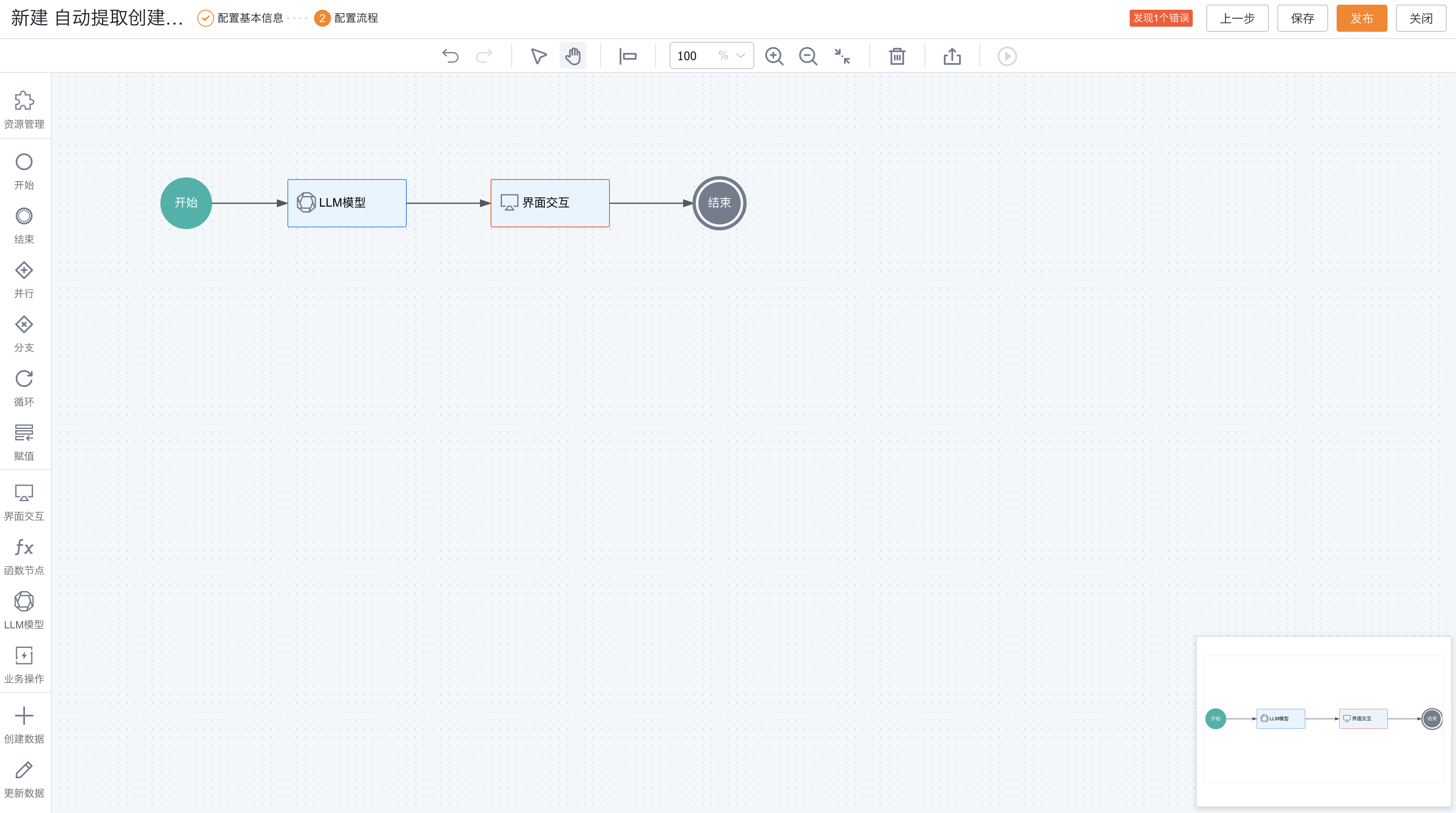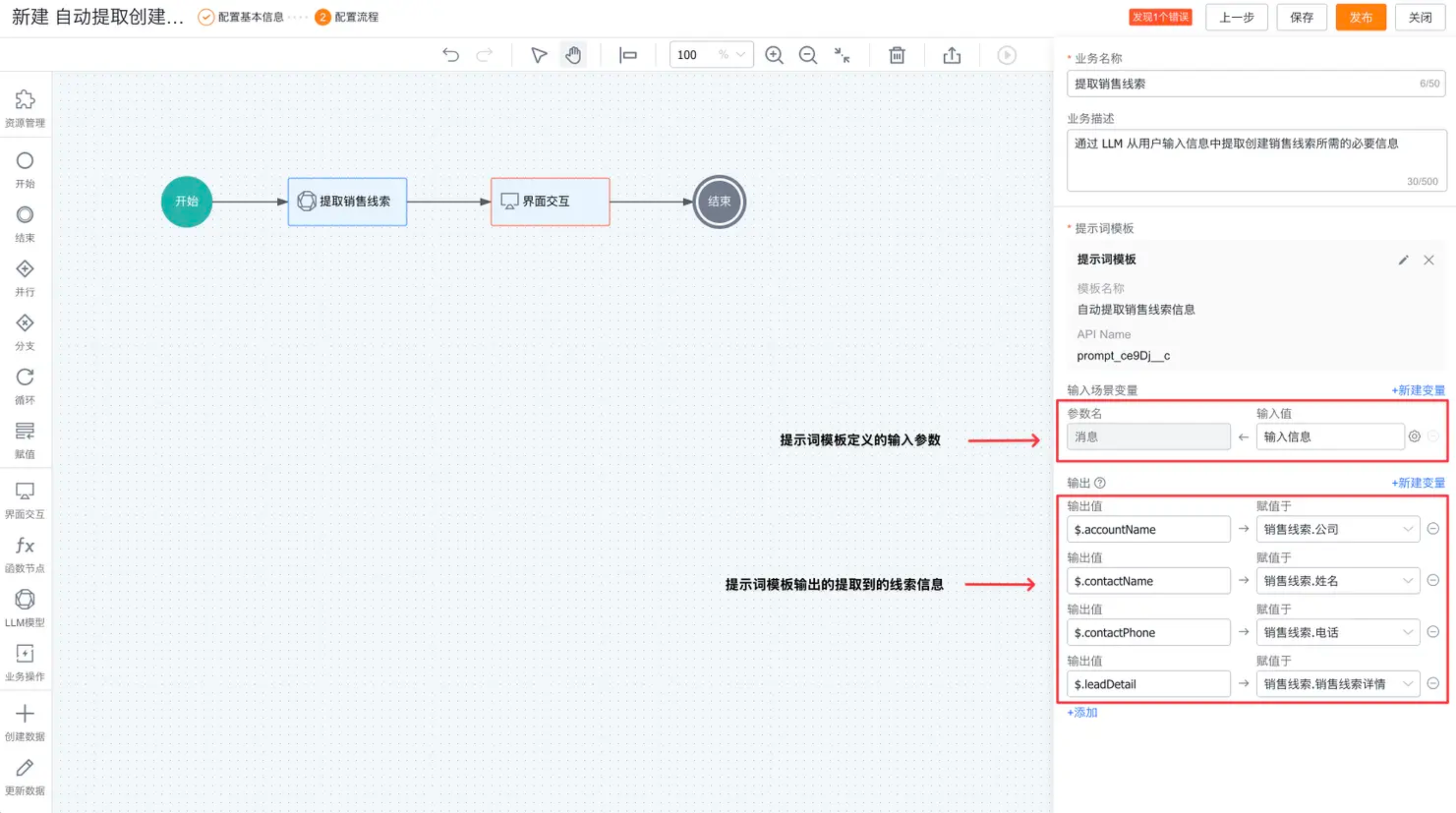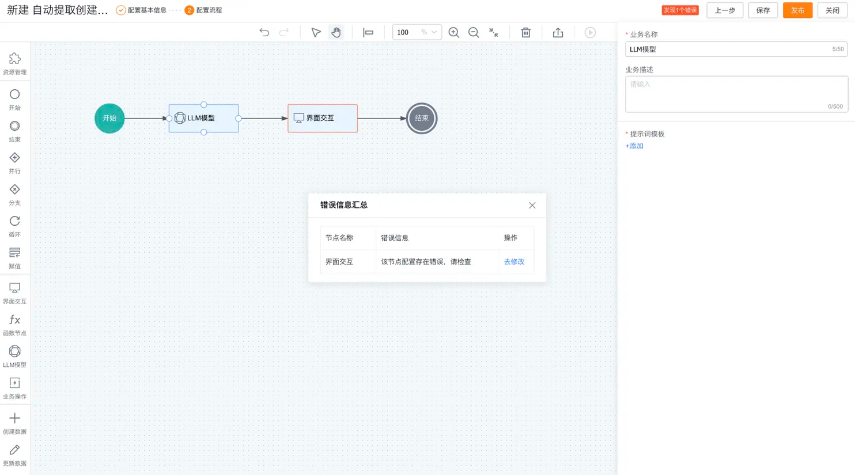 鼠标悬停在工作区的节点上时,可为节点增加连接线,将节点连接起来。此时发现右上角显示“发现1个错误”,点击可查看错误信息汇总。这里的原因是我们只是把节点拖拽了进去,没有配置其参数,下面介绍如何配置流程节点。
