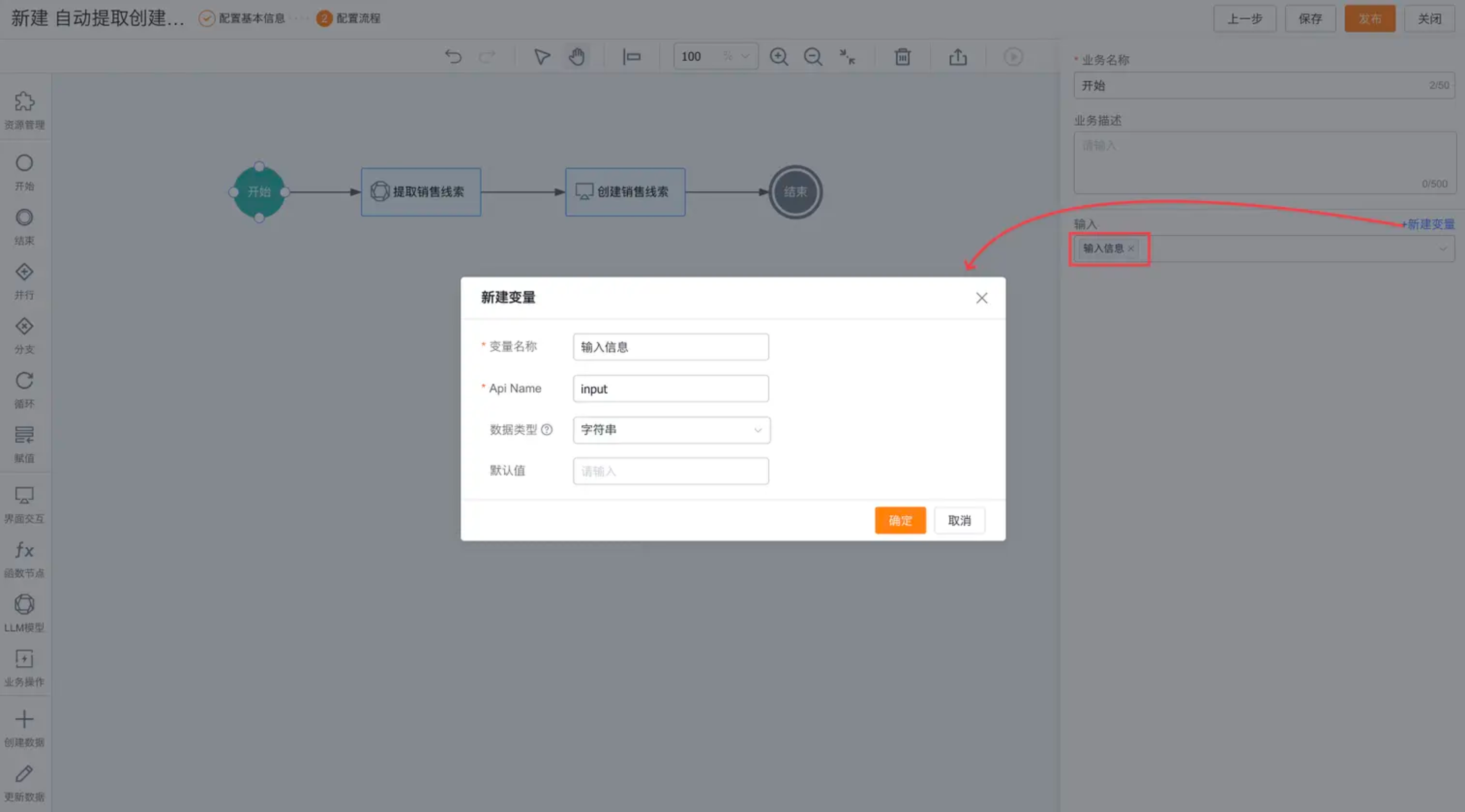 点击工作区的“开始”节点,右侧侧滑显示配置项。新建流程运行时接收的输入变量,这里创建并配置“输入信息”变量。