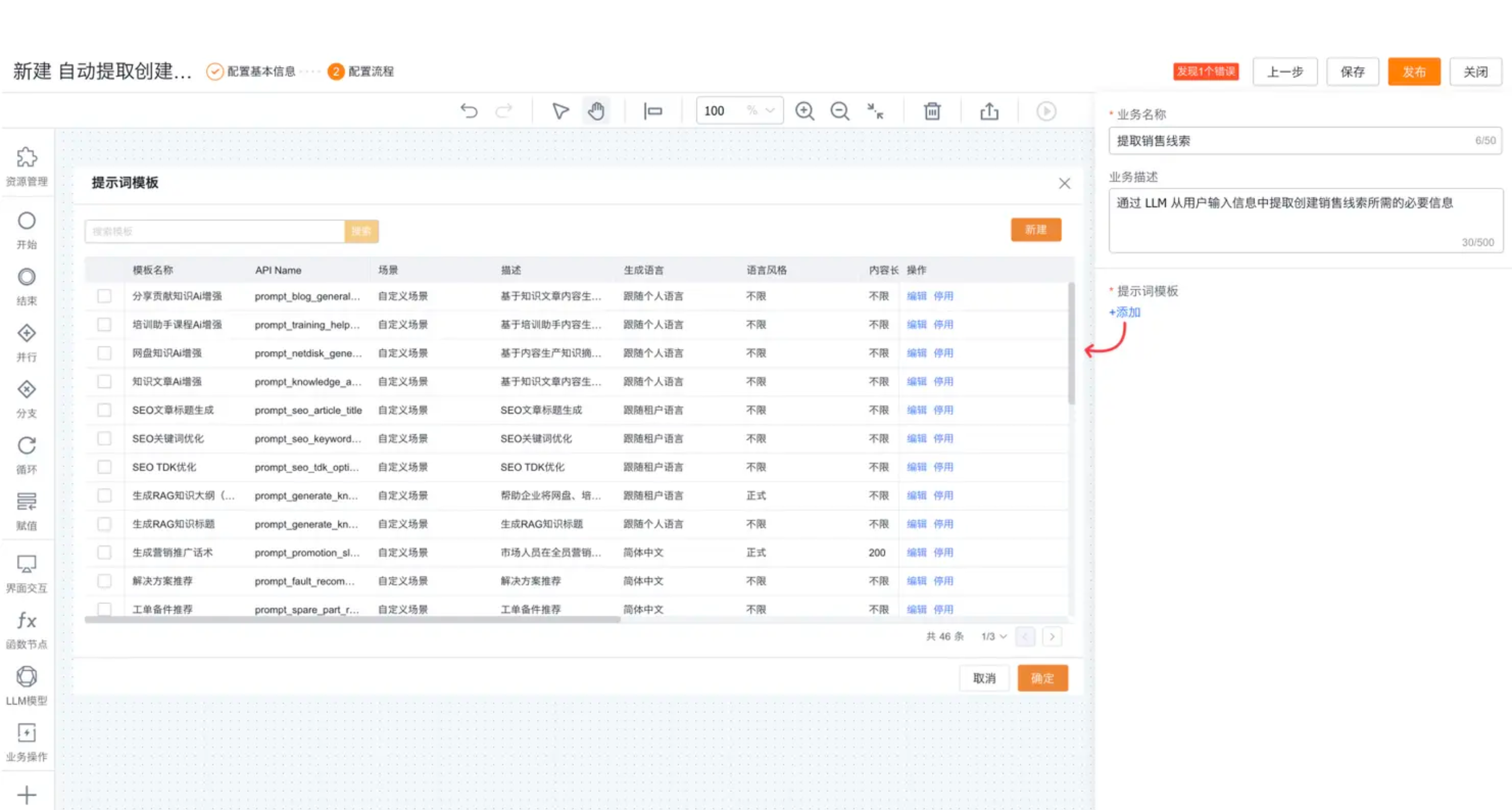 点击工作区的“LLM模型”节点,右侧侧滑显示配置项。选择配置节点的业务名称和业务描述后,可以选择已经创建好的提示词模板或新建提示词模板后再选择。