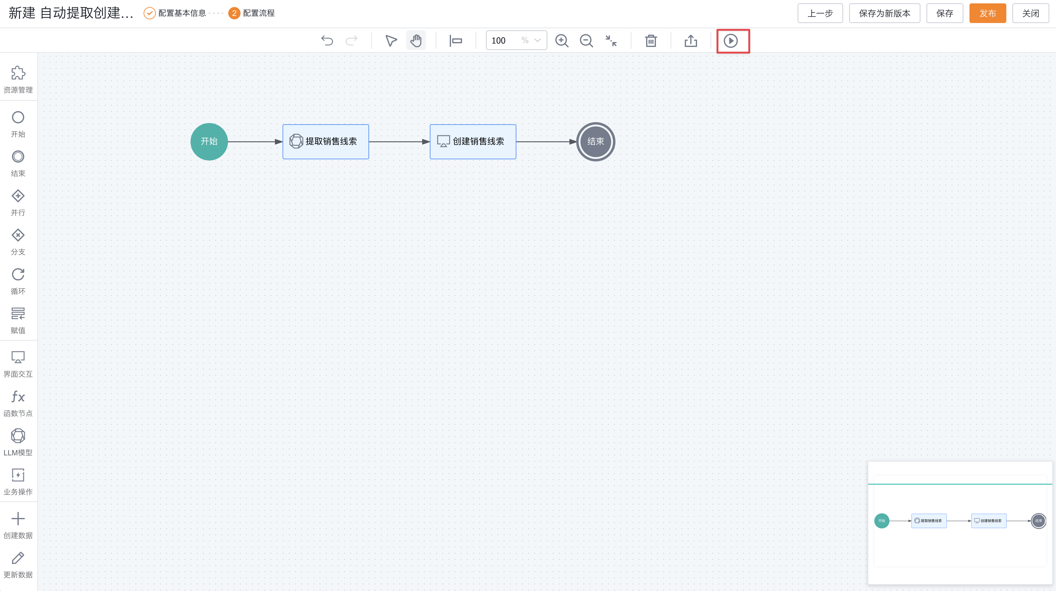 保存流后,点击流设计器工具栏中的运行按钮可以调试运行流。
