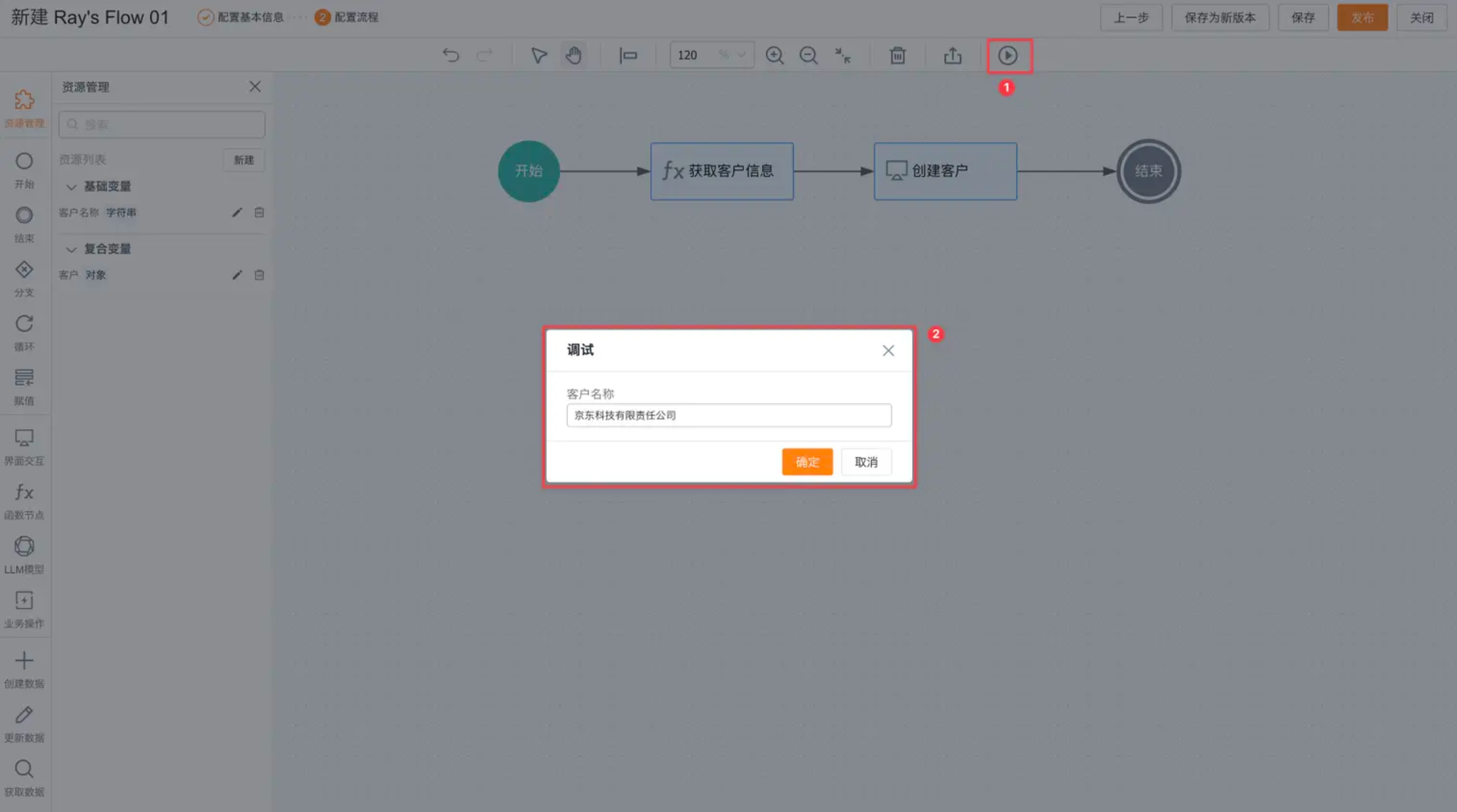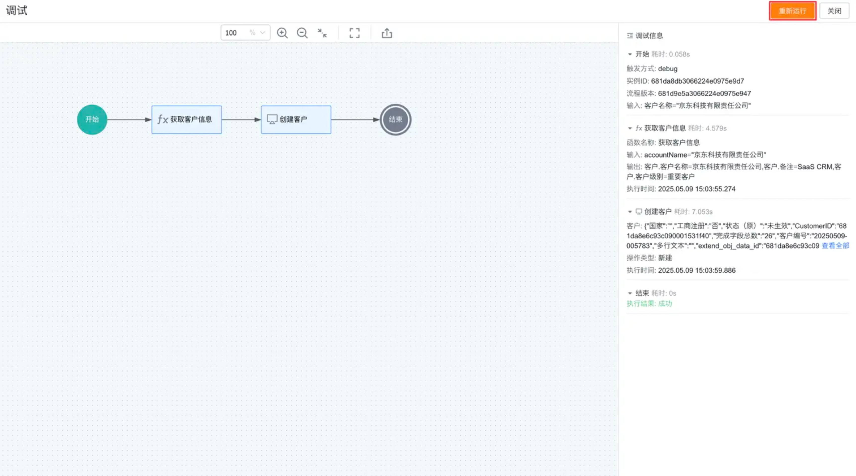 - 在调试运行过程结束后,用户可在调试窗口中查阅详尽的流程调试信息;通过点击右上角的重新运行按钮,即可依据输入参数重新执行流程。
