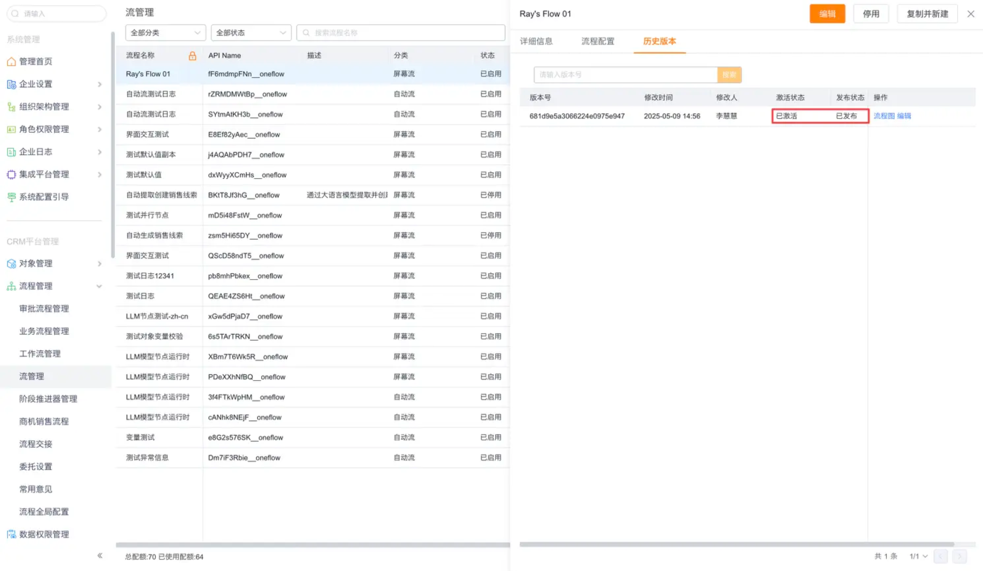 - 在保存未激活状态的流程后,用户可利用发布功能,将其转变为可供业务操作触发的激活状态流程。需注意,每个流程定义仅允许存在一个处于激活状态的版本。