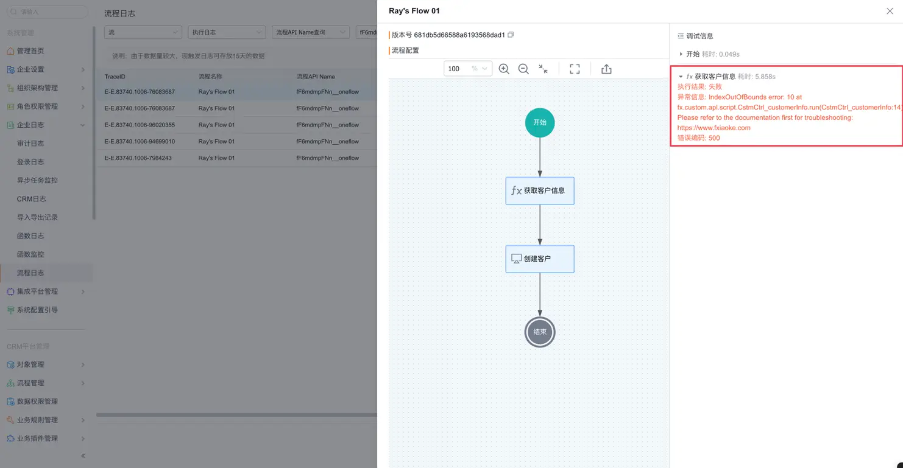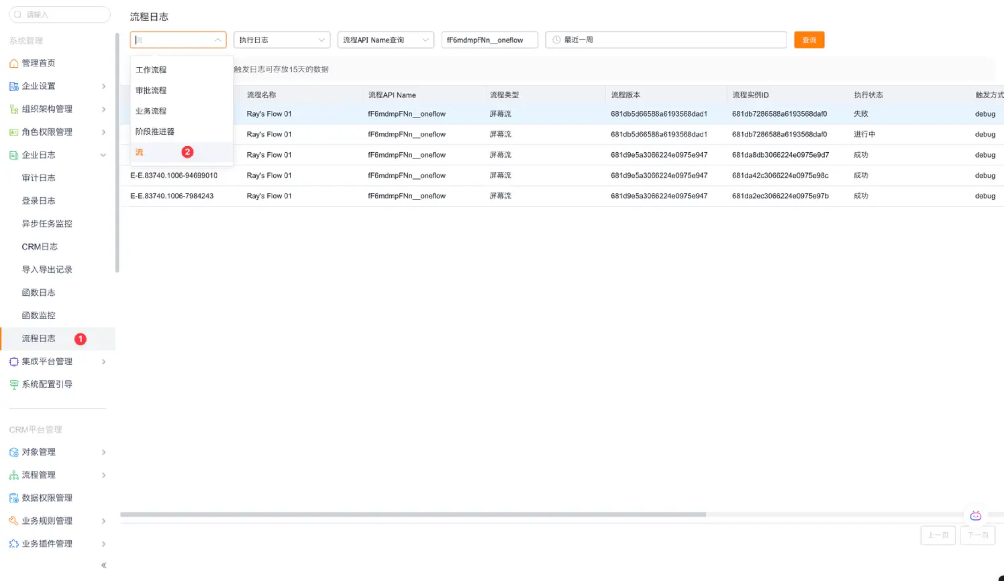 - 在管理后台中,可通过流程日志功能查询并查看业务过程中执行过的流程实例日志。