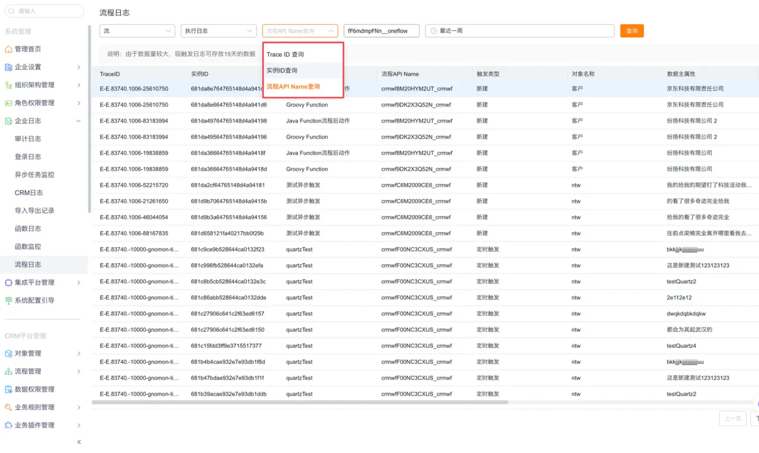 - 可以通过流 API Name、平台全局唯一TraceID、流执行实例 ID 查询流运行日志。
