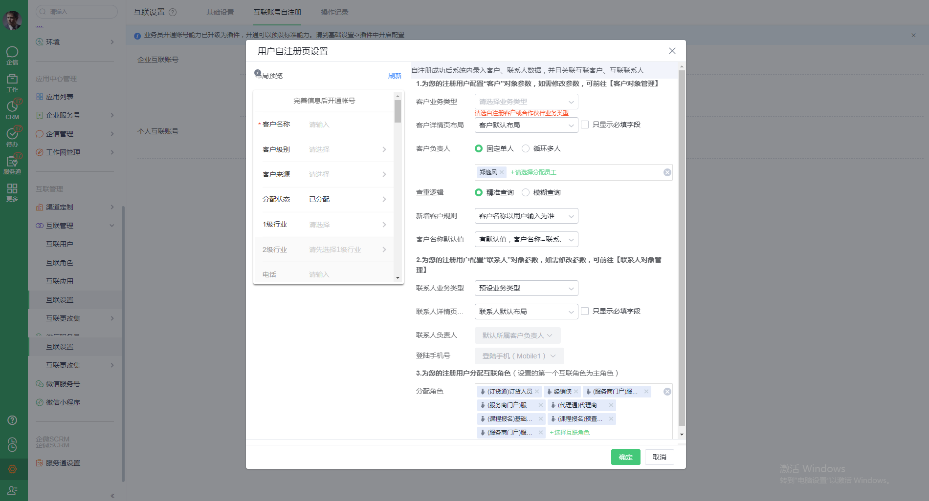 一般开启此设置,表示企业内的业务开放给所有用户,仅仅需要用户注册下相关的客户、联系人信息即可(用户的注册信息是可以在上面的参数中设置的,可以保证收集到企业需要的信息,也可以极简设置为输入下用户名即可),同时还可以设置自注册用户的默认角色,保证用户有帐号后,使用企业授权的相关业务。