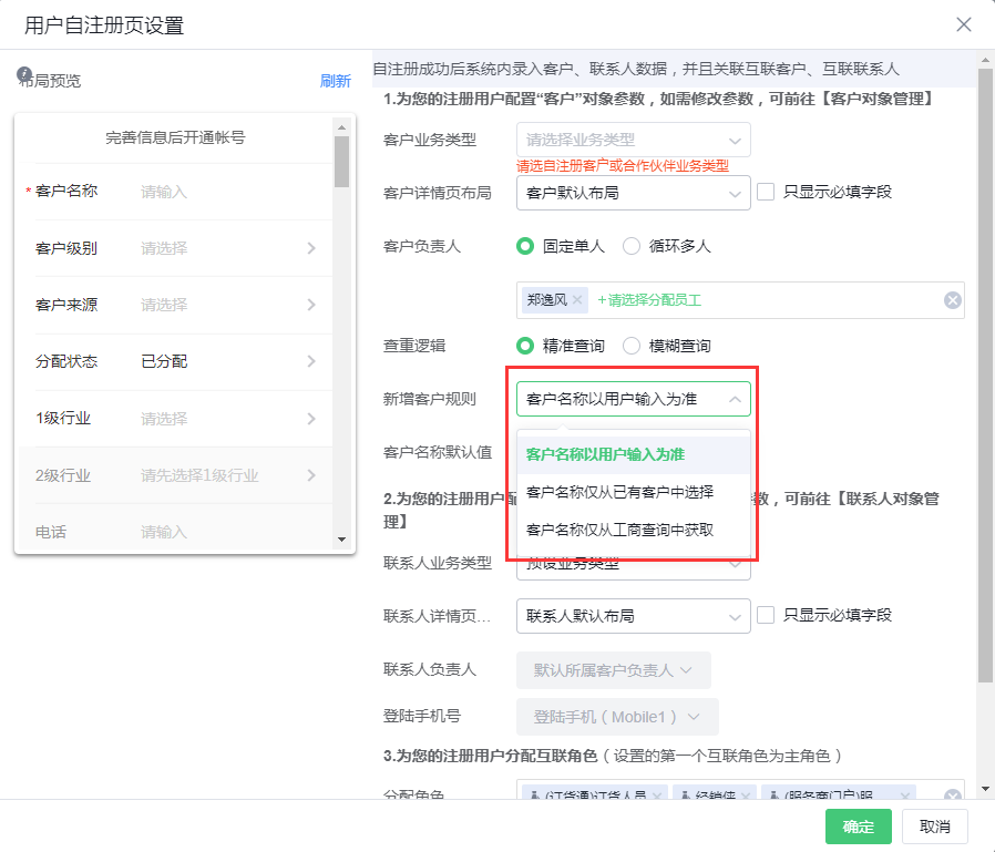 客户负责人:配置注册客户的负责人,支持单人或者多人循环。