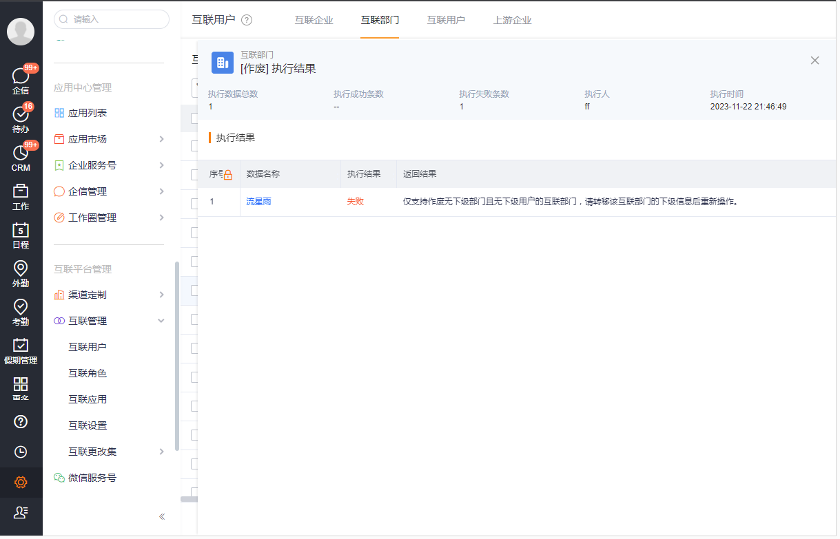 4.互联部门下没有下级部门、没有互联用户的情况下支持作废操作。
