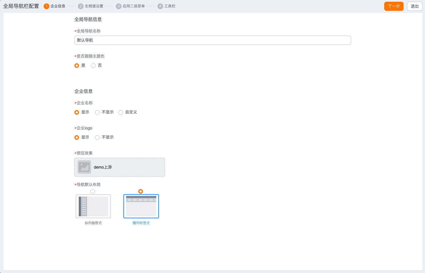 - 支持企业信息设置:包含企业名称是否显示,企业Logo是否显示,导航默认布局(纵向抽屉式和横向标签式)