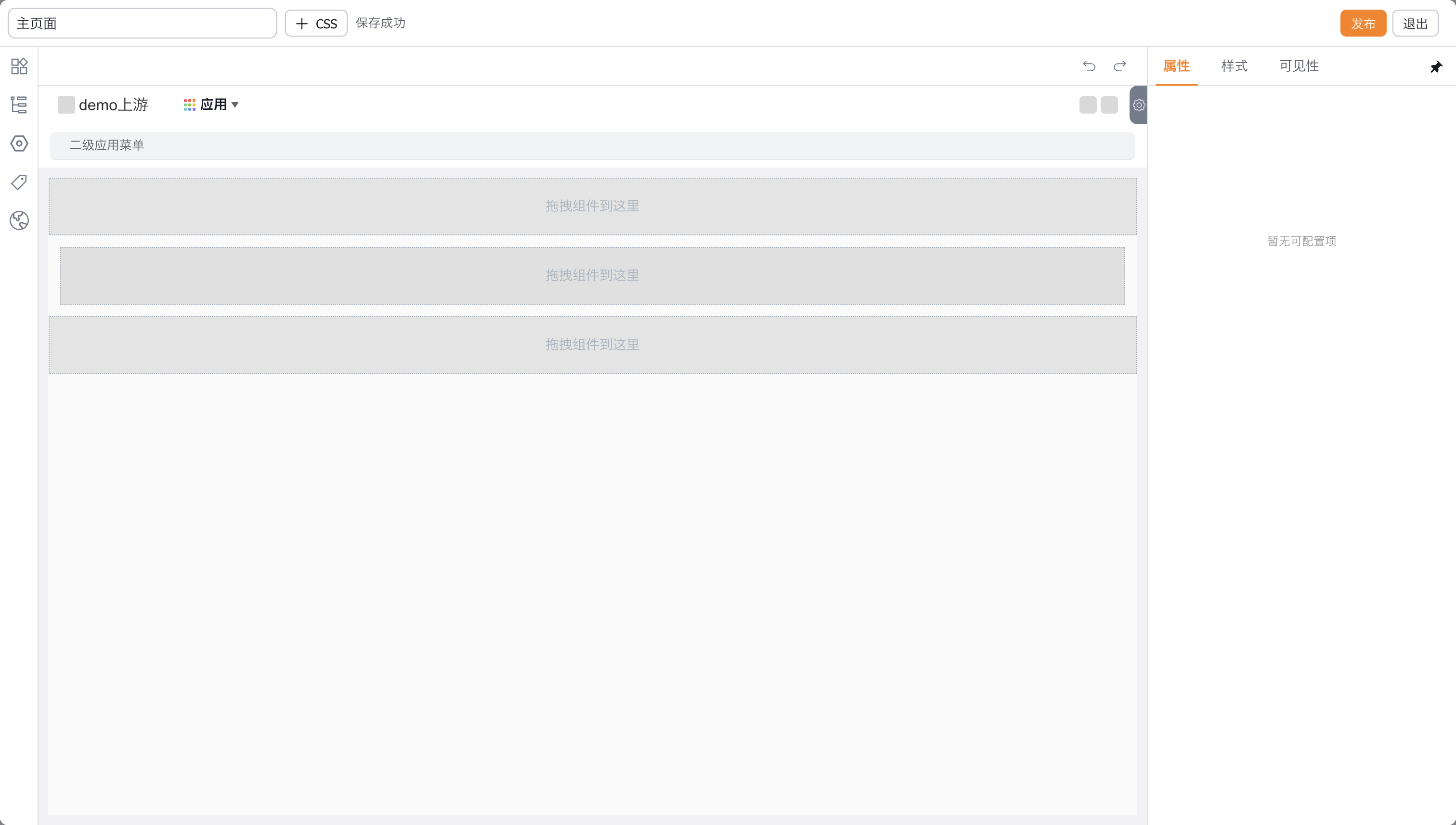 当前主页面的布局样式为【页眉页脚】,顶部的页眉和底部的页脚,拖拉组件后,整个门户内其他的同布局样式的页面都会显示这些组件。